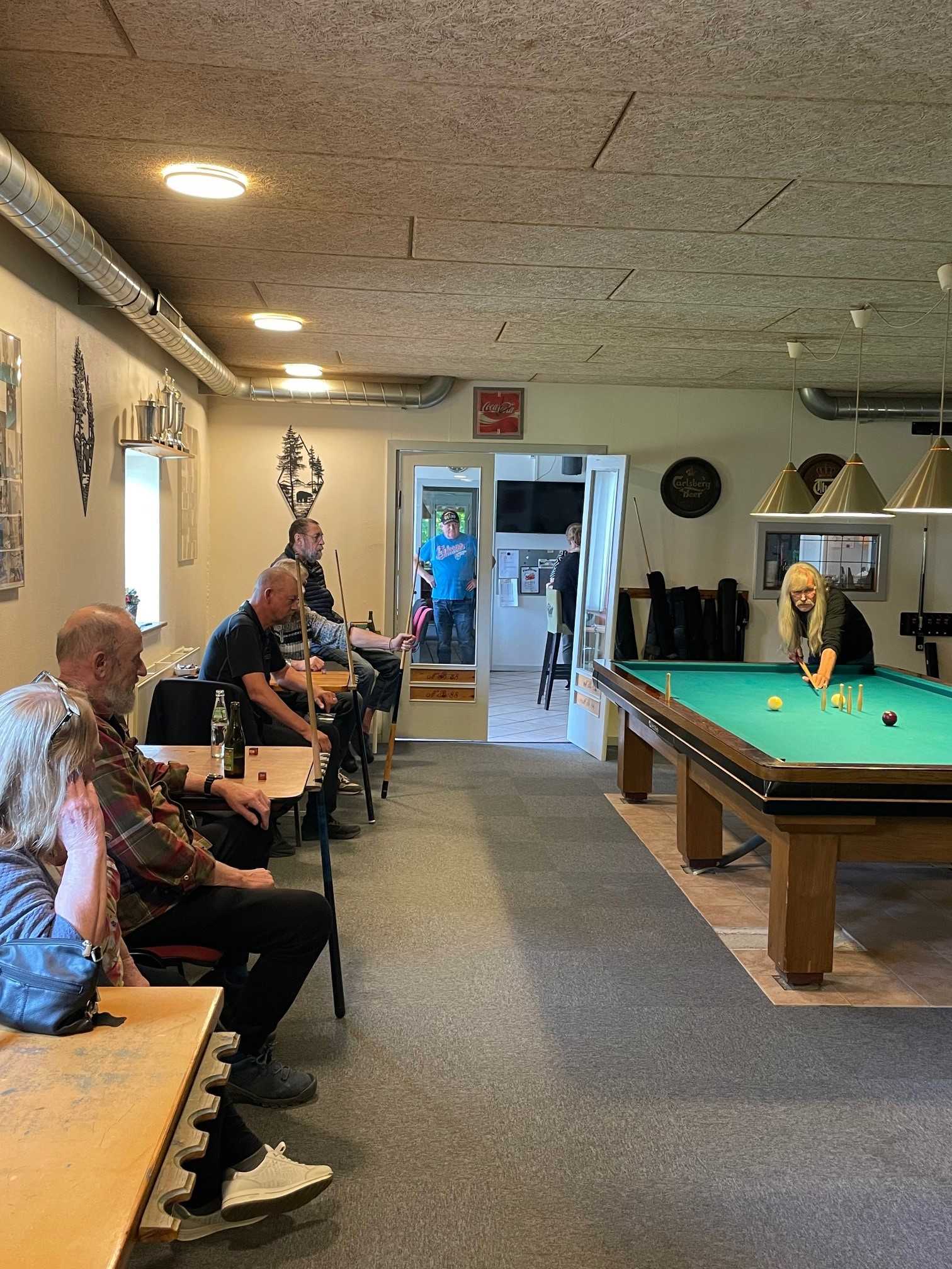 Herefter var det tid til et sceneskifte, for turen gik til Nimtofte Billardklub - NB88 - på Stationsvej 6. Billard er et kompliceret spil, hvor keglerne skal væltes enten direkte eller indirekte og giver forskelligt antal point alt efter, hvilken type billard man spiller.