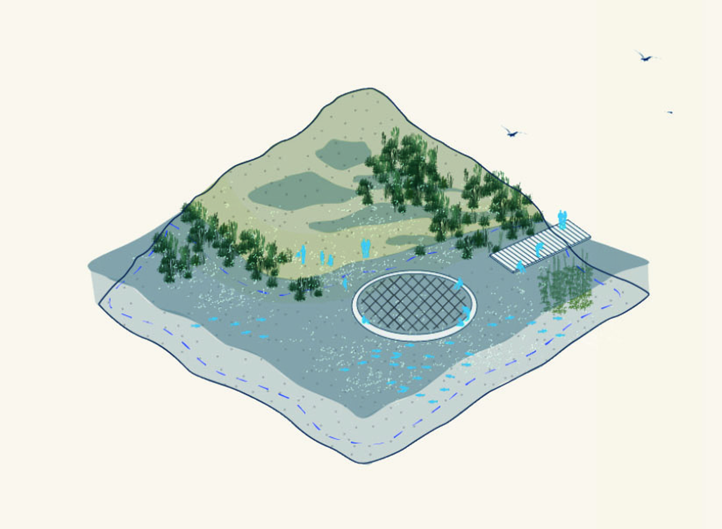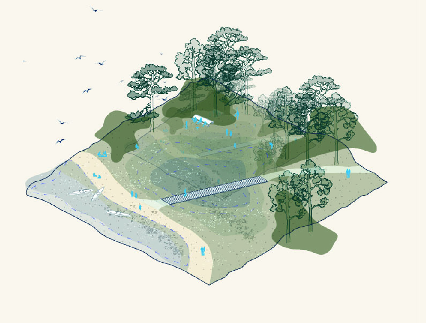 BOGL foreslår et ”vandlaboratorie” og nye rum for oplevelser i landskabet på Halvøen. Her kan man lære om vand, miljø og biodiversitet.