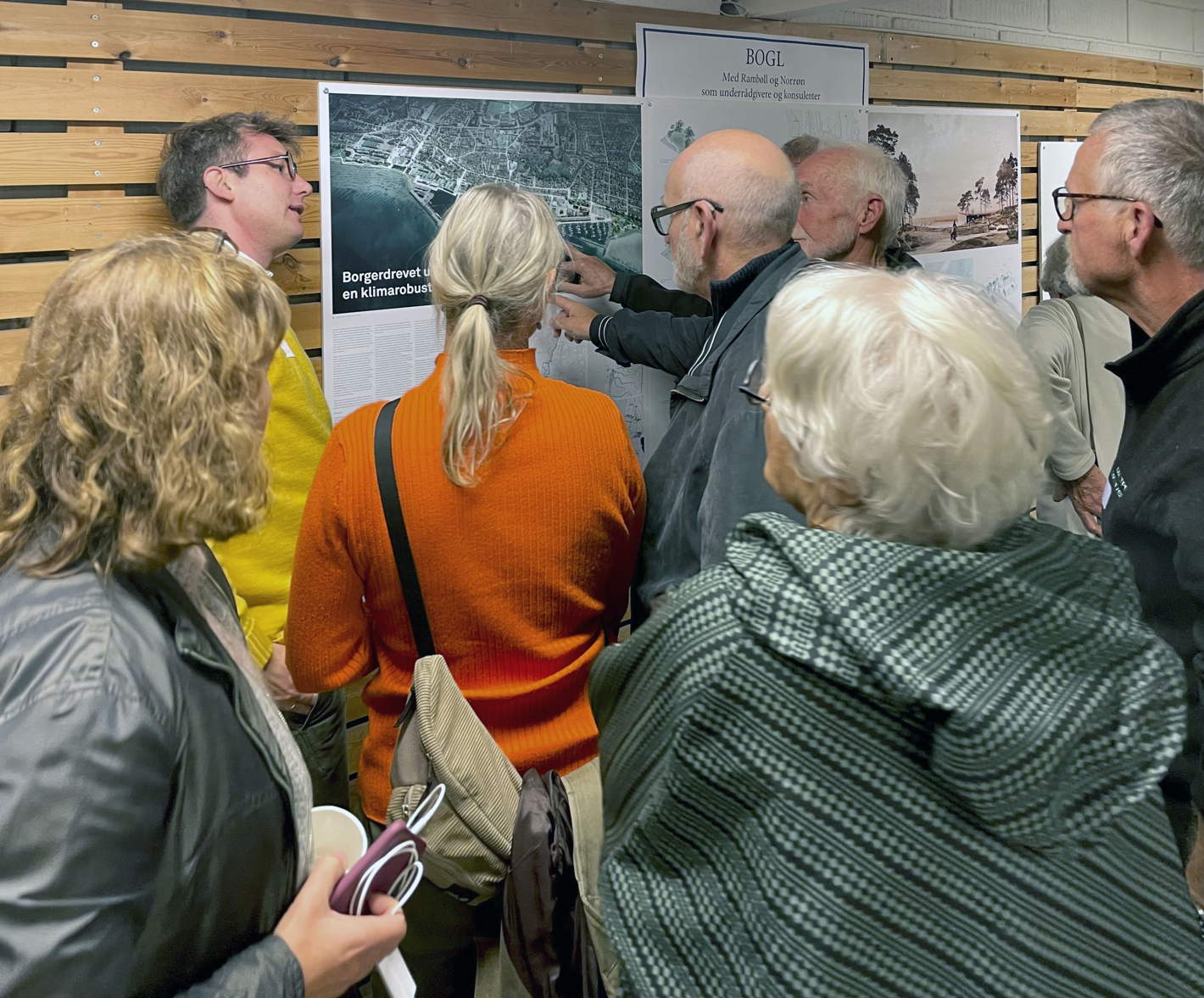 Der var omkring 120 deltagere til BYFORUM på Havnegården torsdag den 29. september, da de tre konkurrenceteams præsenterede deres skitseforslag for hele byen. Her ses klimaspecialist Ulrik Lassen fra Rambøll der er i dialog med byens borgere om det, der senere viste sig, at være vinderprojektet udarbejdet af arkitektvirksomheden BOGL.
