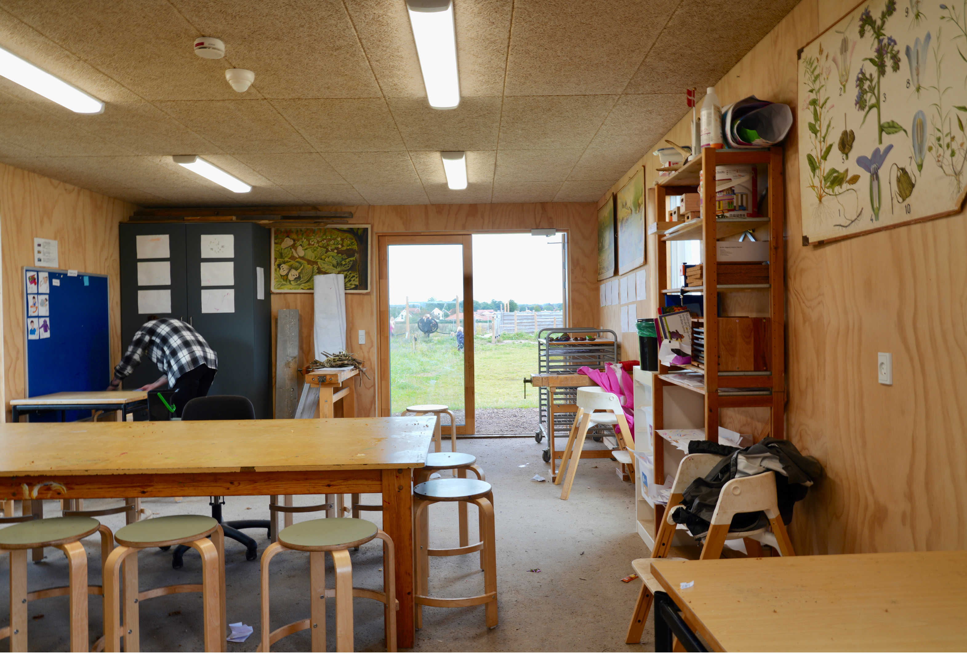På den store legeplads, der omkranser tre af husets sider, er der plantet træer og skabt mulighed for varierende leg i det grønne. En multifunktionel værkstedsbygning på legepladsen fungerer som endnu et ude/inde rum, der kan rumme diverse aktiviteter og hvor madpakker kan indtages i ly og læ for vejret, og således kan børnegrupperne fordeles ud mange steder på matriklen. Projektet rummer mange funktionelle detaljer, som f.eks. et toilet, der kan tilgås både inde fra huset og ude fra legepladsen, så der spares tid til unødige af- og påklædninger, når man som barn er midt i legen på legepladsen. På legepladsen er der desuden plads til, at børnene selv bygger cykelbaner af sandsække, ligesom vandpytter og små bakker indtages ivrigt af husets vigtigste beboere.
