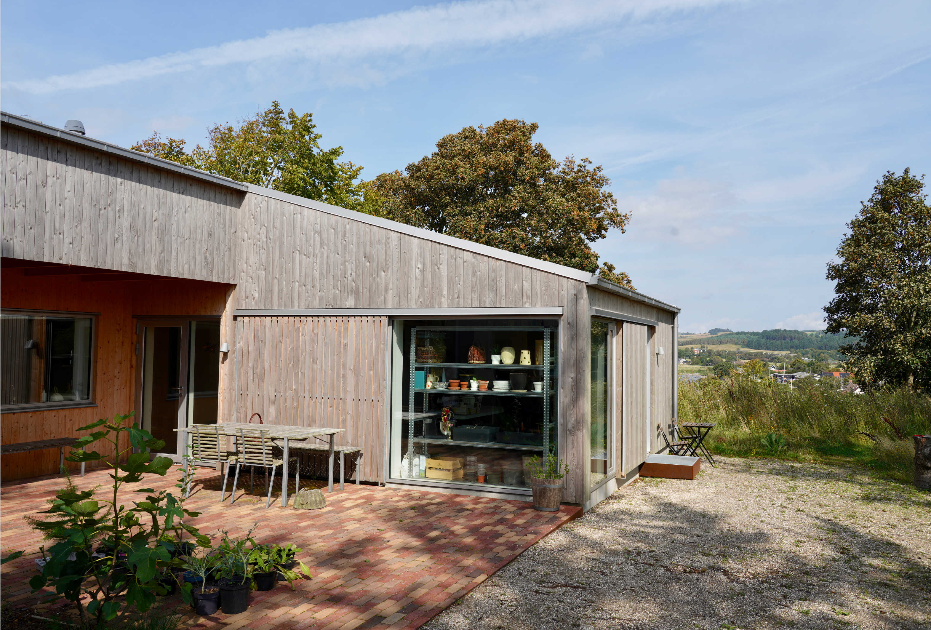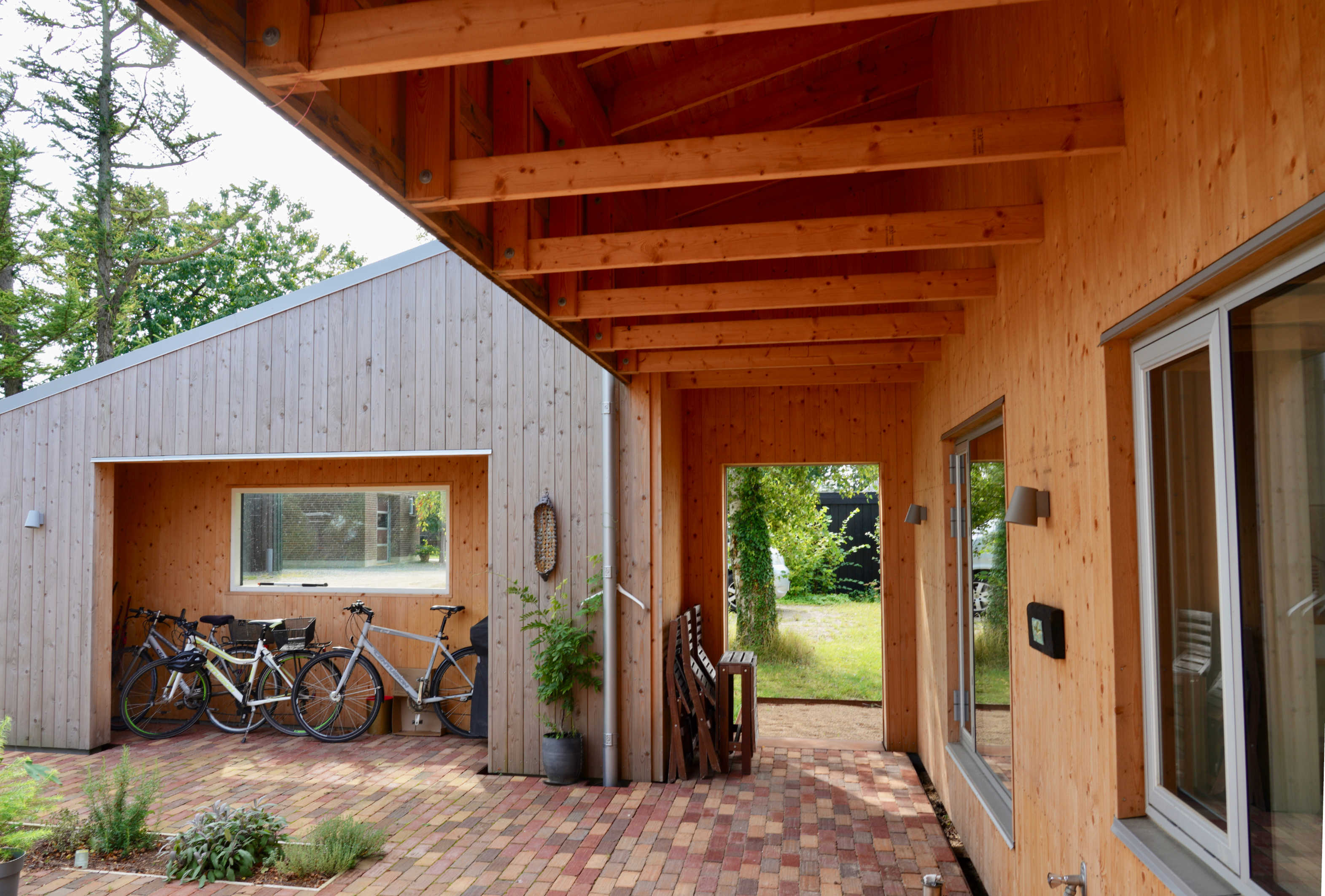 Huset består af træ i både konstruktion og beklædning, hvor sidstnævnte står ubehandlet hen med den karakteristiske sølvgrå farve, der indfinder sig med tiden. Taget er af stål. Huset har store udhæng mod gårdhave og den nordvendte terrasse og ud over solafskærmning, skaber det et rum langs facaden, som en mellemzone mellem ude og inde.