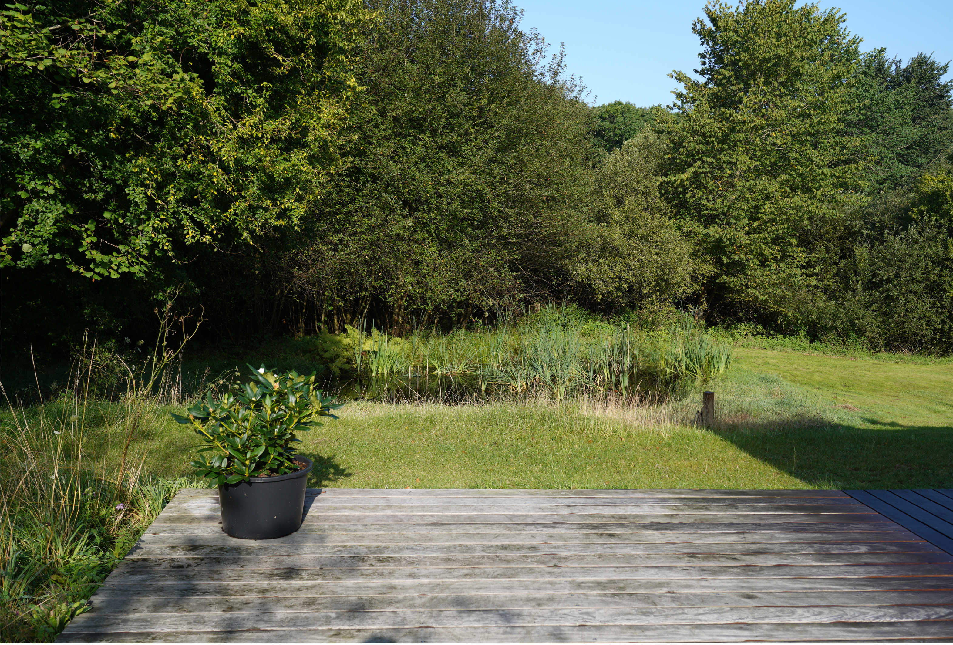 Sommerhuset er placeret på et lavt maritimt forland - Sænkningen - for foden af et morænelandskab med oplevelsesrige bakker fra istiden. På grunden er der en lille dam, der omkranses af en dekorativ sivbevoksning.