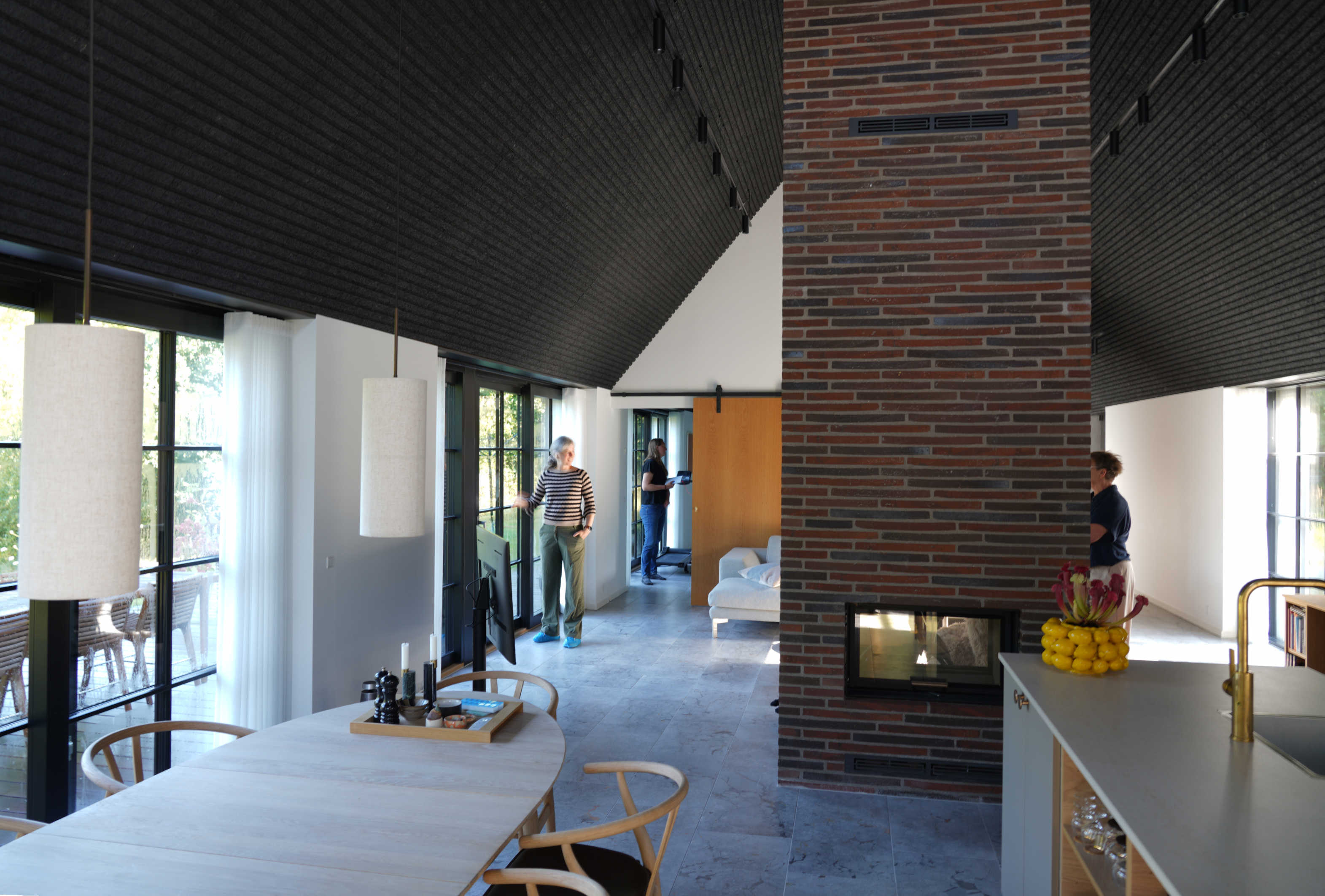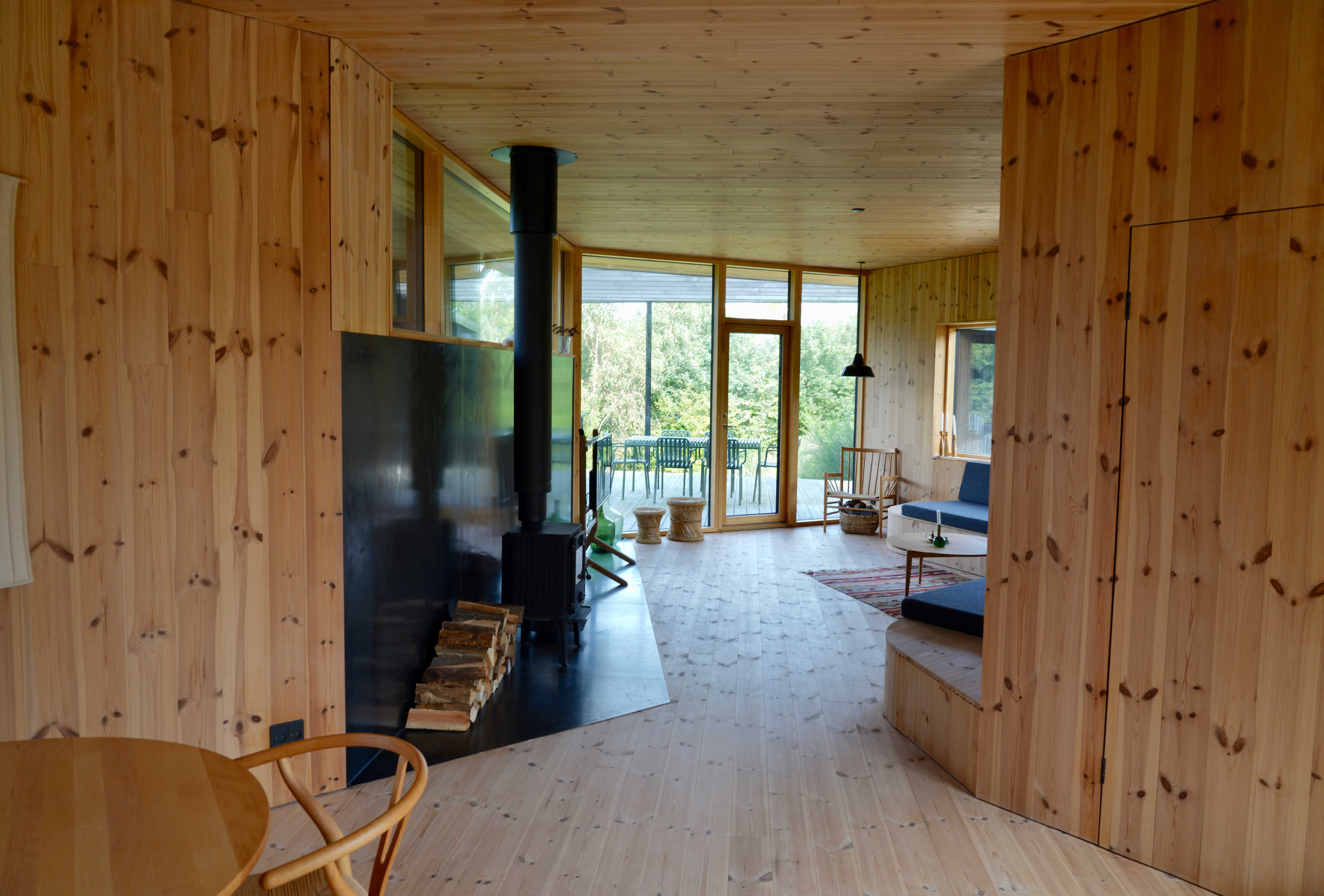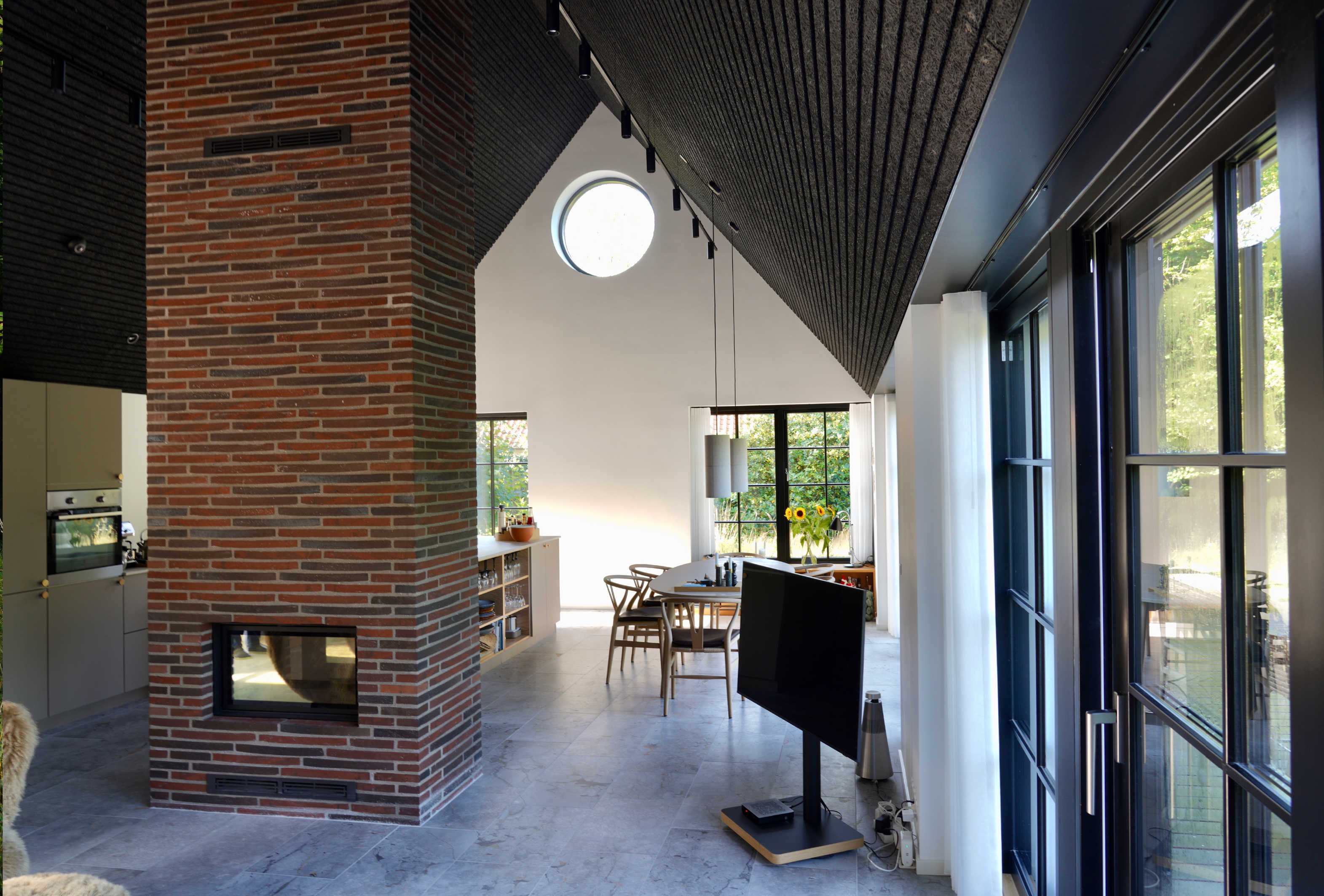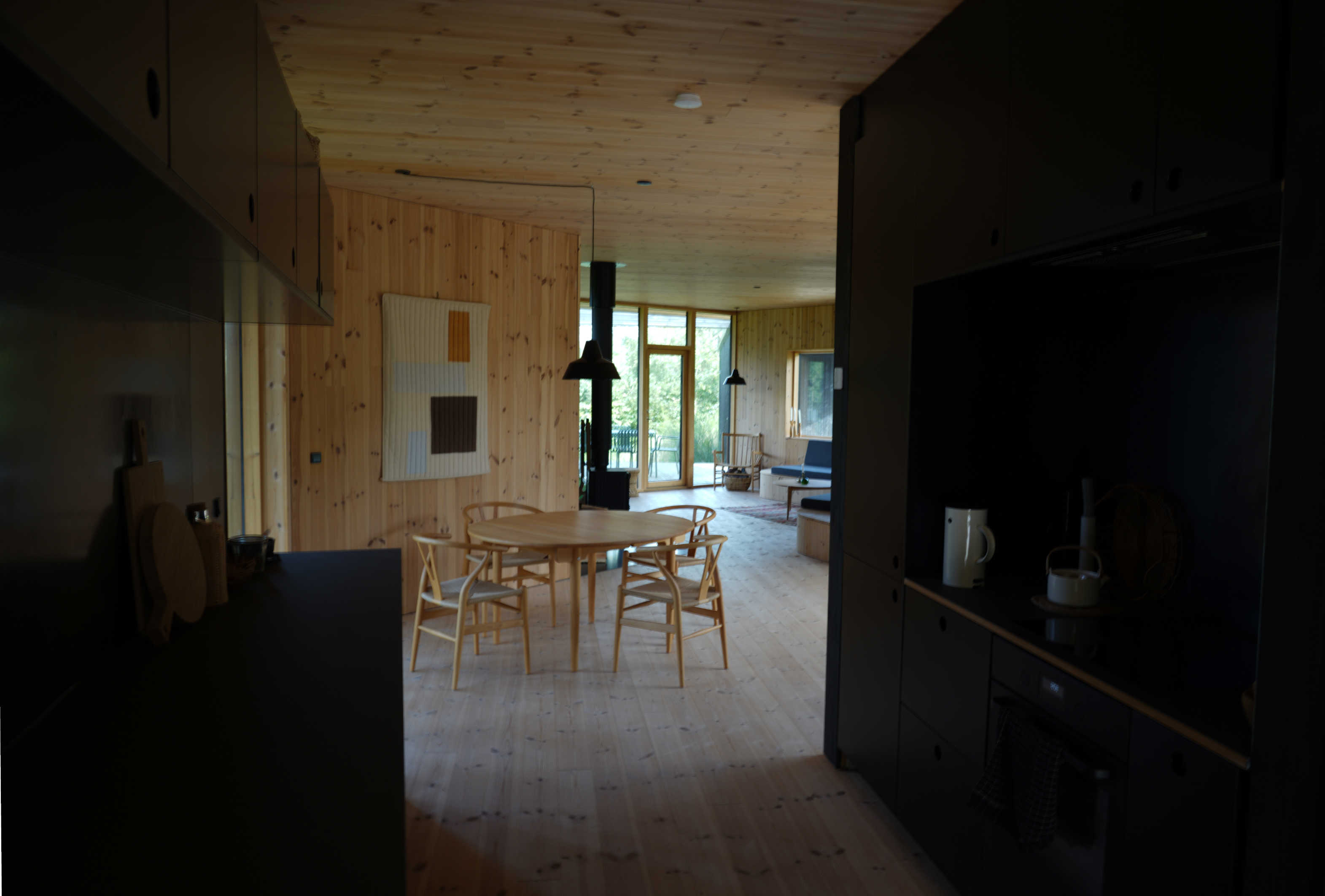 Den gode fornemmelse fortsætter inde i huset, hvor en karakterfuld fritstående skorsten med pejs danner rum og introducerer et storslået vue til et smukt køkken- og opholdsrum med højt til loftet. Mod nord er mindre rum med værelser, bad og toilet. Overbevisende arkitektoniske greb, som loftet der alle steder er åbent til kip og beklædt med en ubrudt mørk og støjdæmpende loftsbeklædning, det niveaufrie og gennemgående gulv med natursten fra Sicilien og langsidernes store, fint underopdelte, glaspartier tydeliggør på forbilledlig vis længehusets dna og forener på en overbevisende måde funktion og æstetik. Valget af gode, gedigne naturlige materialer er sympatisk og den håndværksmæssige bearbejdning af de delikate flader og detaljer er af høj kvalitet. Facadernes sortmalede partier af træ kan umiddelbart virke lidt kedelige, men den sikre opdeling af træbeklædningen og vinduespartiernes fine detaljer giver sammen med lysets reflekser og skyggespillet spændingsfyldte oplevelser.