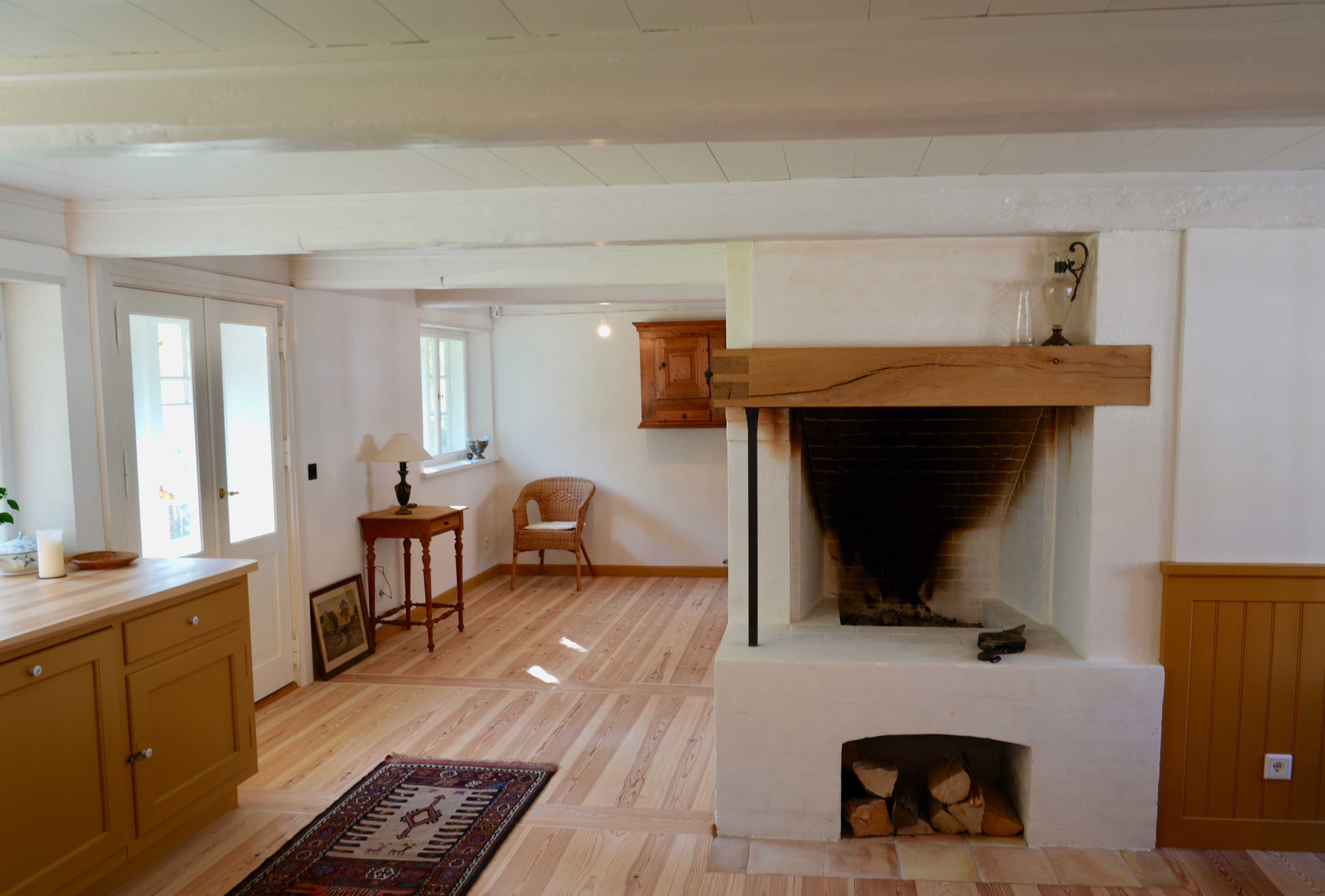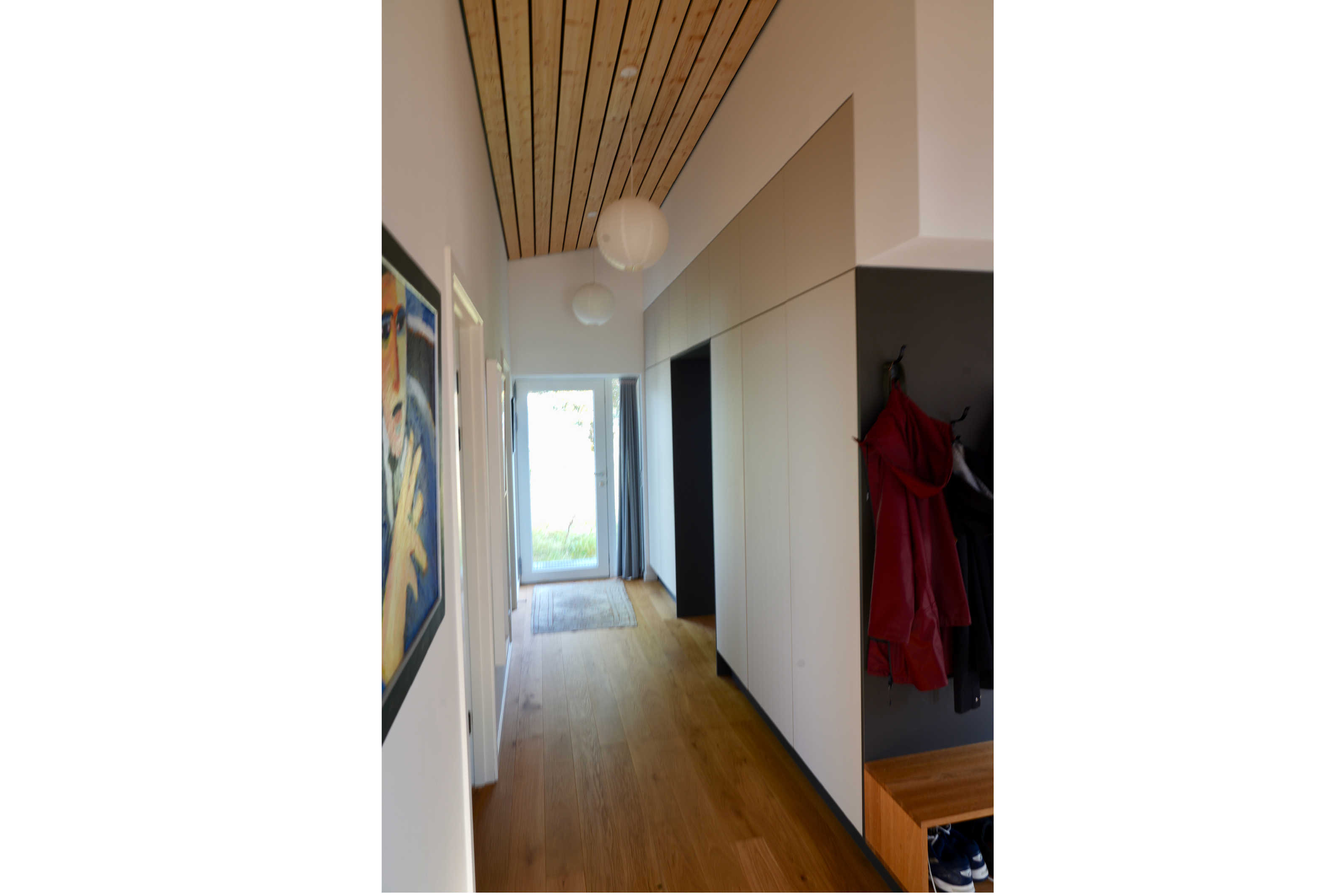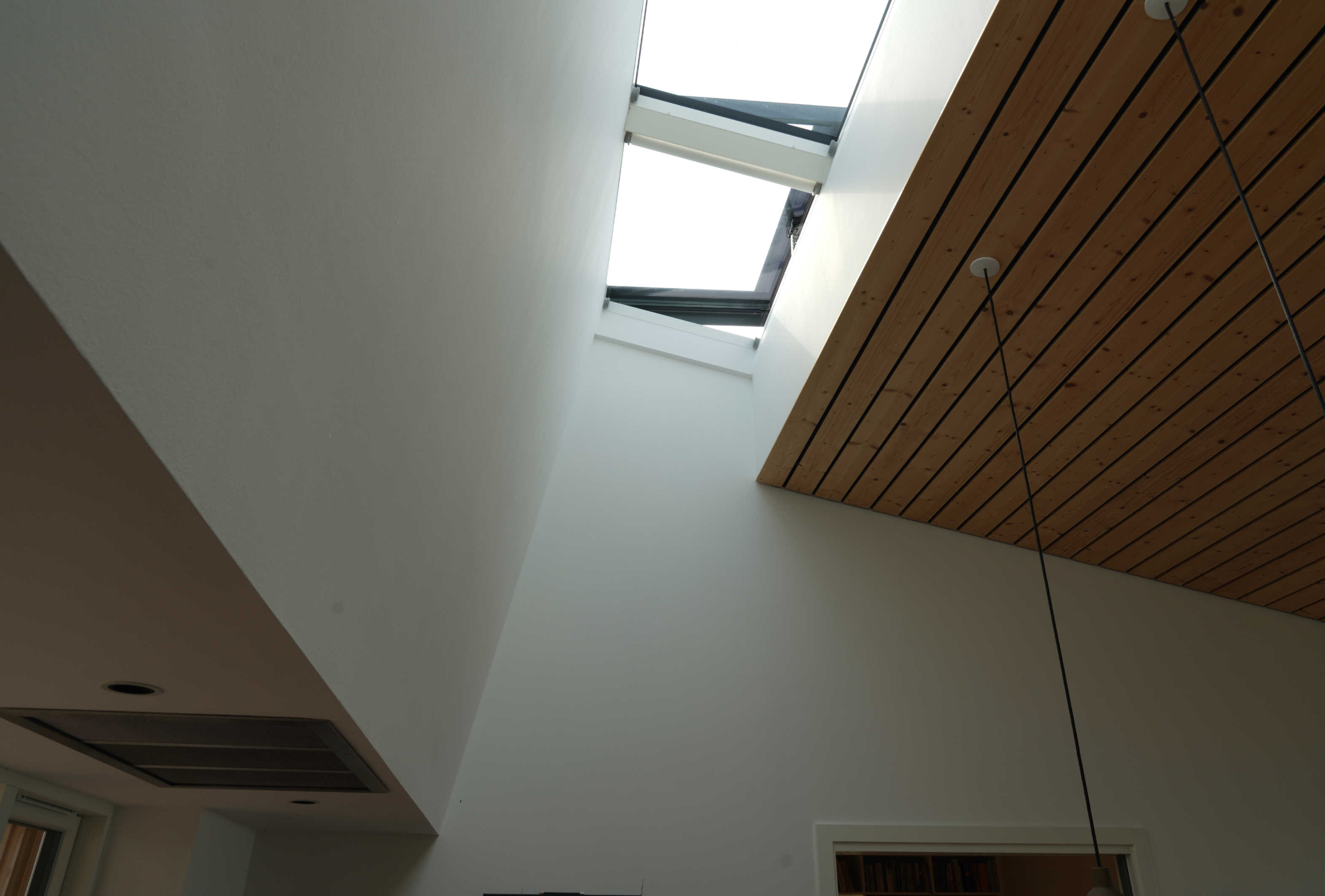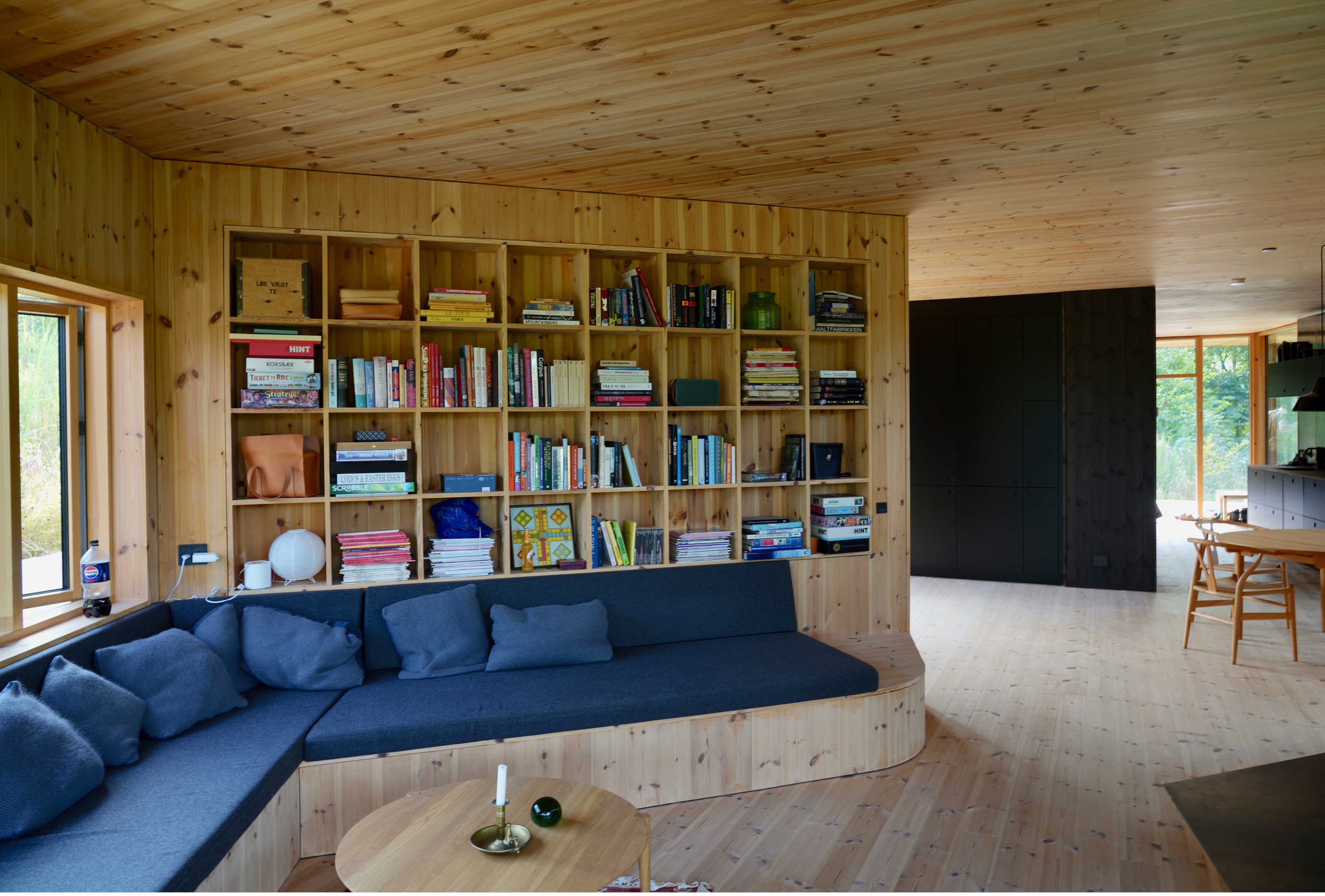 Den gode fornemmelse fortsætter inde i huset, hvor en karakterfuld fritstående skorsten med pejs danner rum og introducerer et storslået vue til et smukt køkken- og opholdsrum med højt til loftet. Mod nord er mindre rum med værelser, bad og toilet. Overbevisende arkitektoniske greb, som loftet der alle steder er åbent til kip og beklædt med en ubrudt mørk og støjdæmpende loftsbeklædning, det niveaufrie og gennemgående gulv med natursten fra Sicilien og langsidernes store, fint underopdelte, glaspartier tydeliggør på forbilledlig vis længehusets dna og forener på en overbevisende måde funktion og æstetik. Valget af gode, gedigne naturlige materialer er sympatisk og den håndværksmæssige bearbejdning af de delikate flader og detaljer er af høj kvalitet. Facadernes sortmalede partier af træ kan umiddelbart virke lidt kedelige, men den sikre opdeling af træbeklædningen og vinduespartiernes fine detaljer giver sammen med lysets reflekser og skyggespillet spændingsfyldte oplevelser.