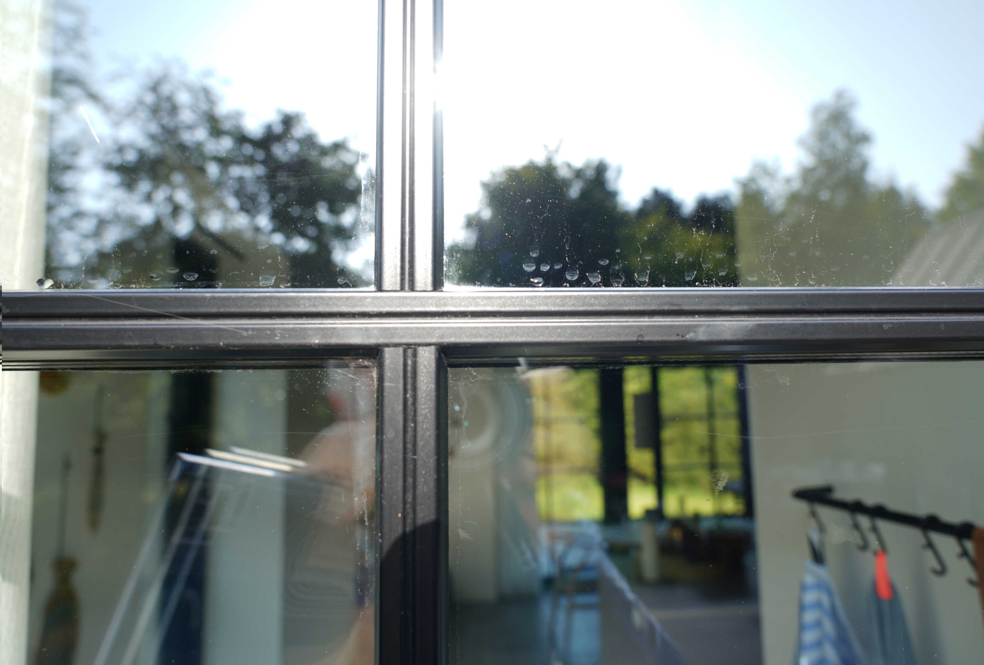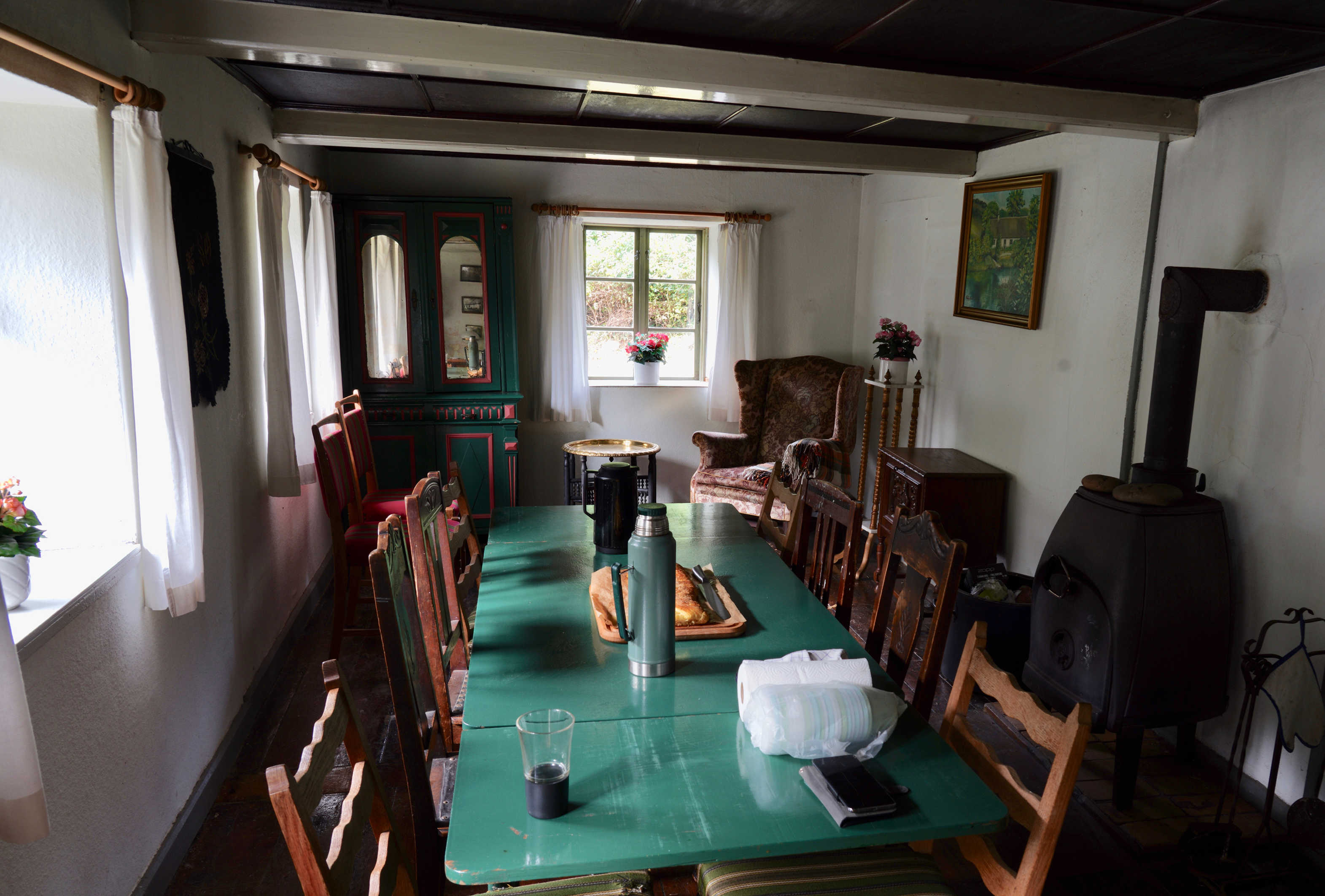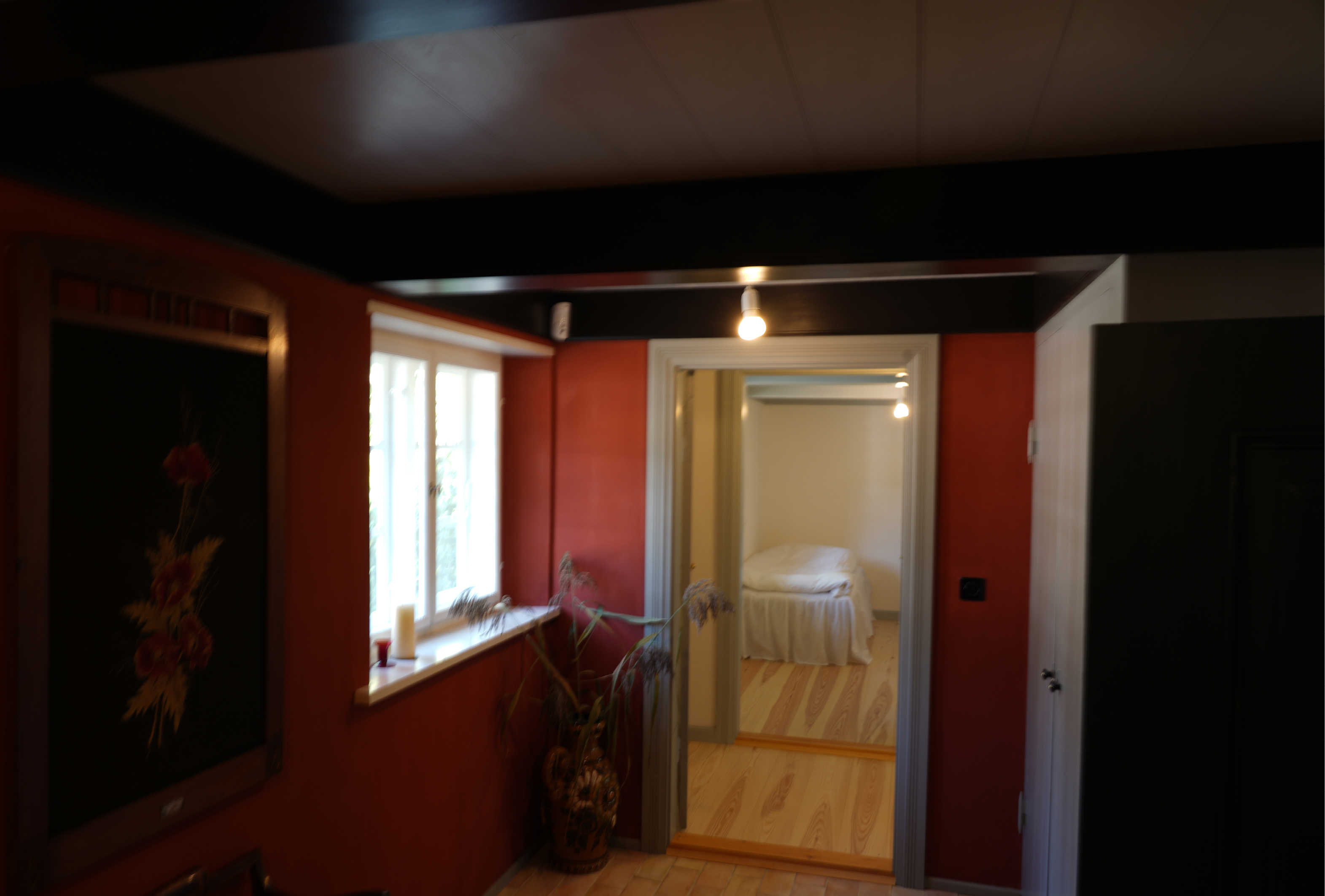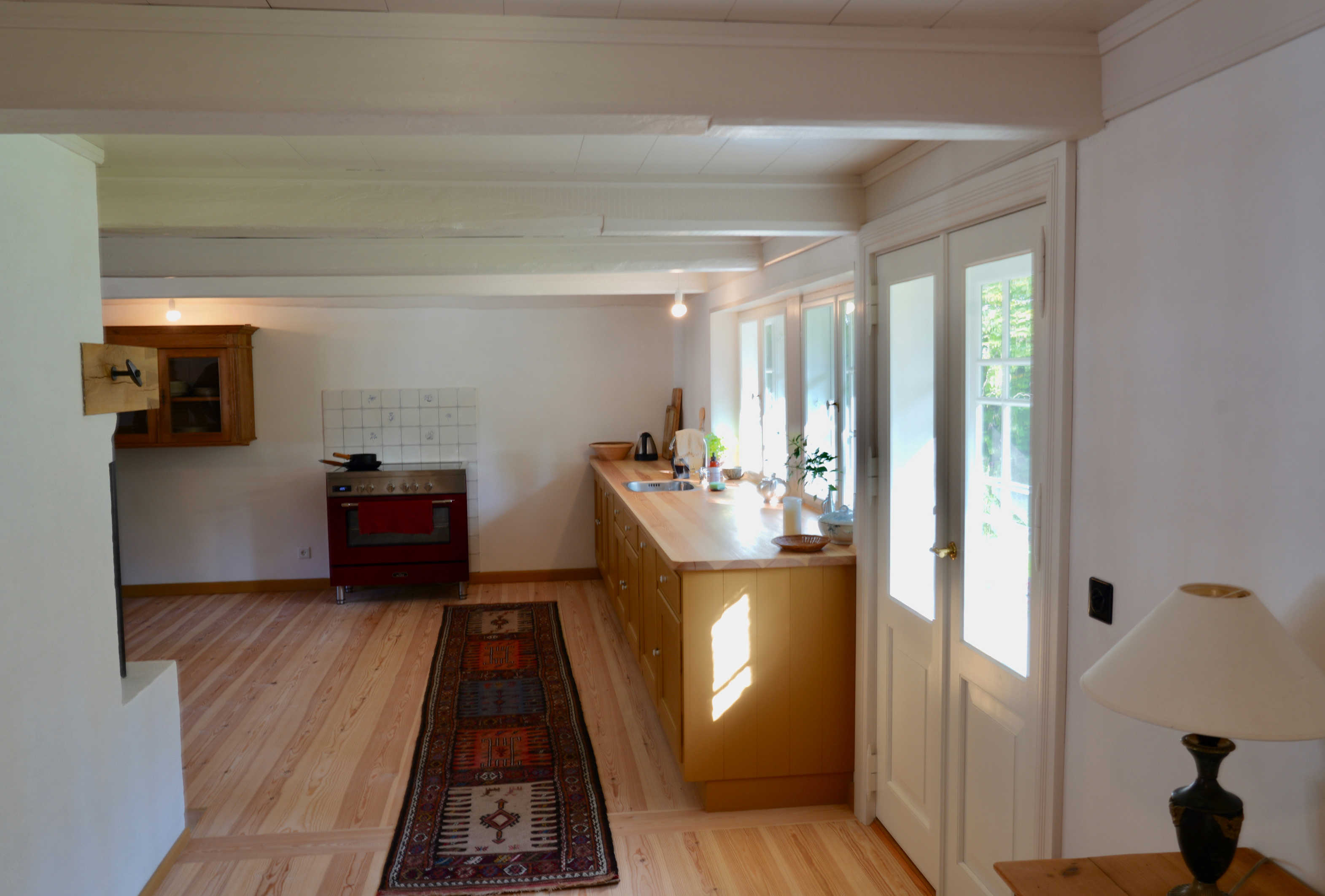 Den gode fornemmelse fortsætter inde i huset, hvor en karakterfuld fritstående skorsten med pejs danner rum og introducerer et storslået vue til et smukt køkken- og opholdsrum med højt til loftet. Mod nord er mindre rum med værelser, bad og toilet. Overbevisende arkitektoniske greb, som loftet der alle steder er åbent til kip og beklædt med en ubrudt mørk og støjdæmpende loftsbeklædning, det niveaufrie og gennemgående gulv med natursten fra Sicilien og langsidernes store, fint underopdelte, glaspartier tydeliggør på forbilledlig vis længehusets dna og forener på en overbevisende måde funktion og æstetik. Valget af gode, gedigne naturlige materialer er sympatisk og den håndværksmæssige bearbejdning af de delikate flader og detaljer er af høj kvalitet. Facadernes sortmalede partier af træ kan umiddelbart virke lidt kedelige, men den sikre opdeling af træbeklædningen og vinduespartiernes fine detaljer giver sammen med lysets reflekser og skyggespillet spændingsfyldte oplevelser.