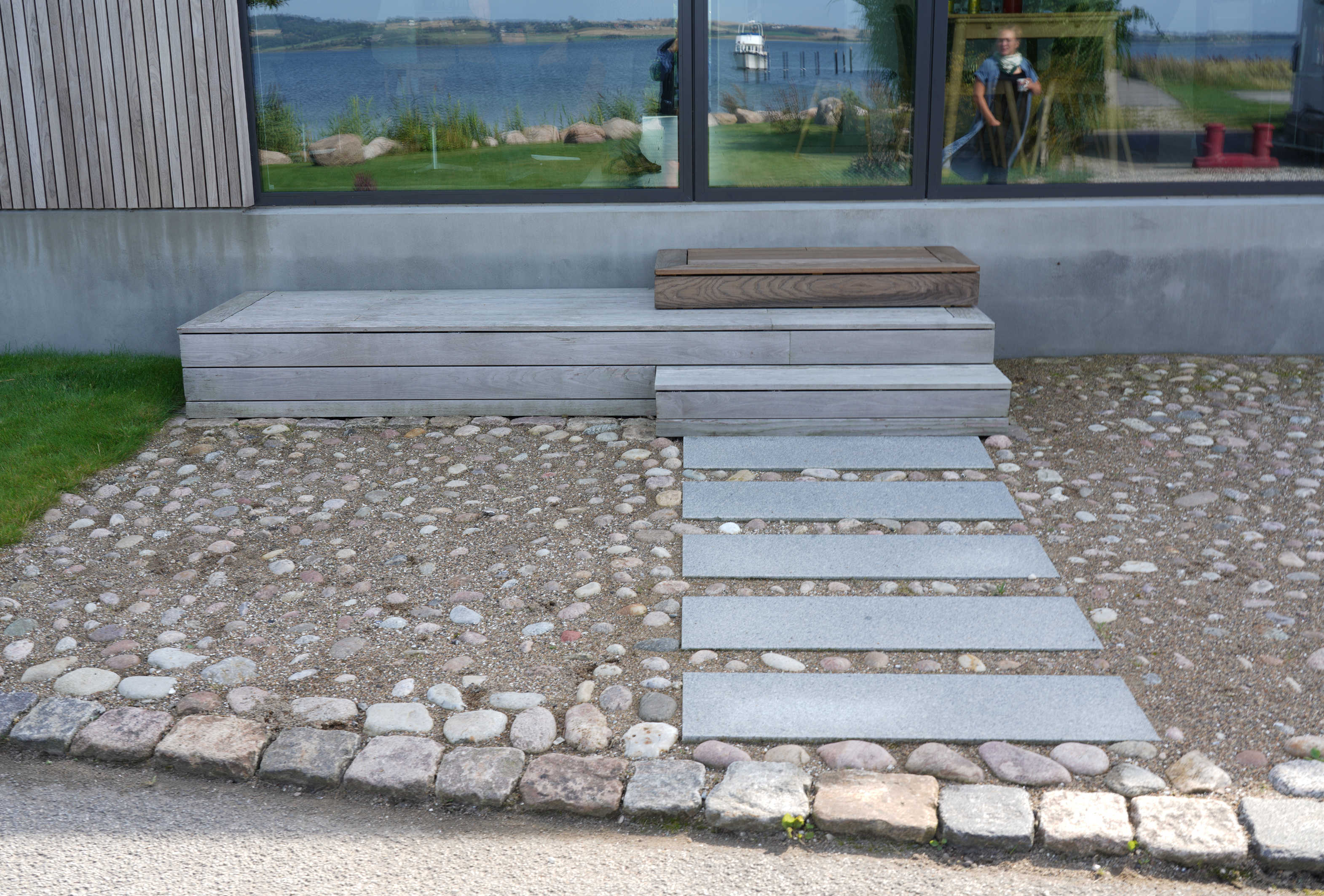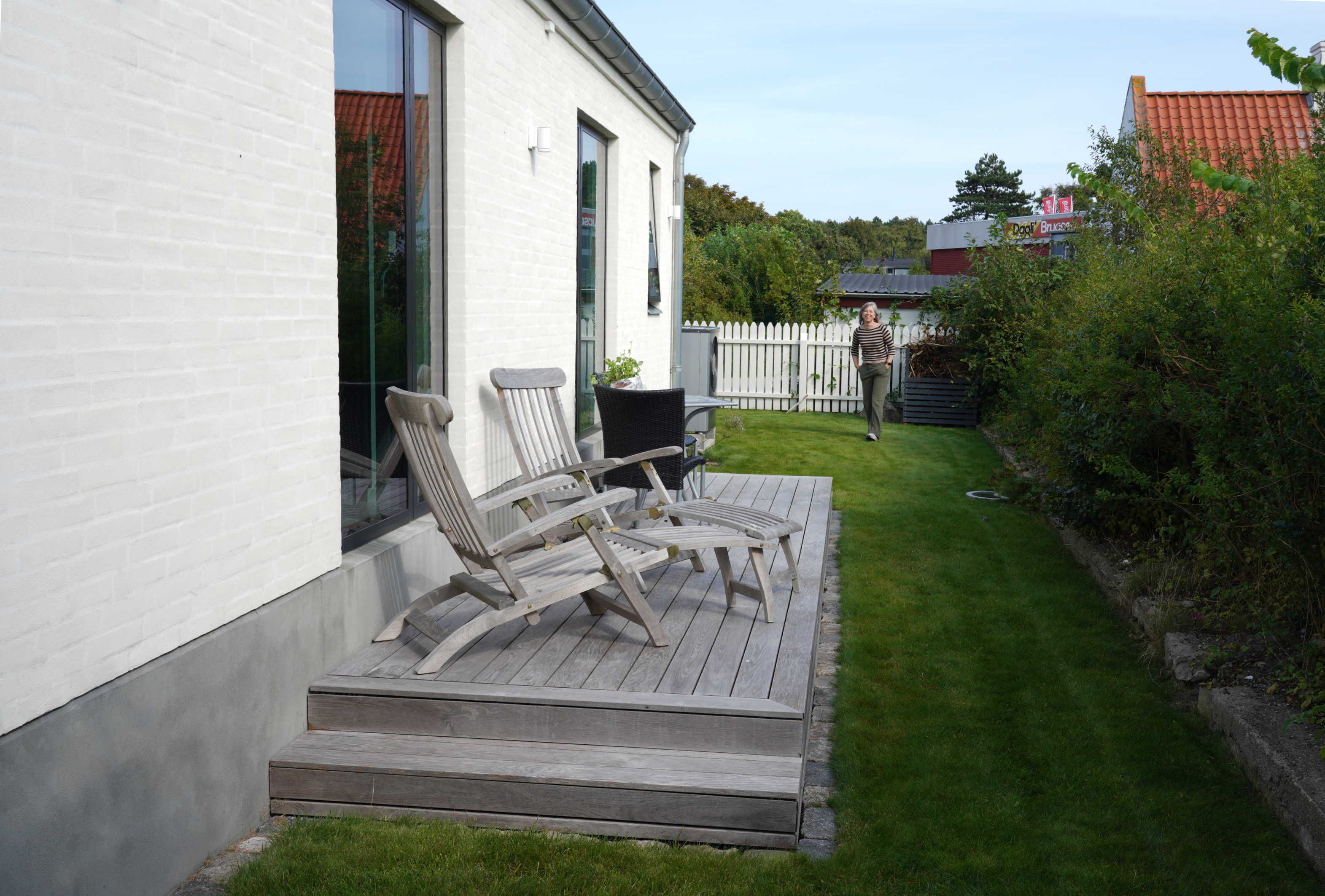 Når man kommer til stedet virker disponeringen af grunden enkel og let forståelig. Mod syd og den nærmeste nabo, er der en smal have, der afgrænses af en hæk. Mod øst, vest og nord er der åbent mod det offentlige rum. Det giver mulighed for oceaner af indkig, men med en smuk pigstensbelægning og et hævet udsigtsplateau skabes en halvprivat opholdszone, som danner en buffer mellem det private og det offentlige rum.