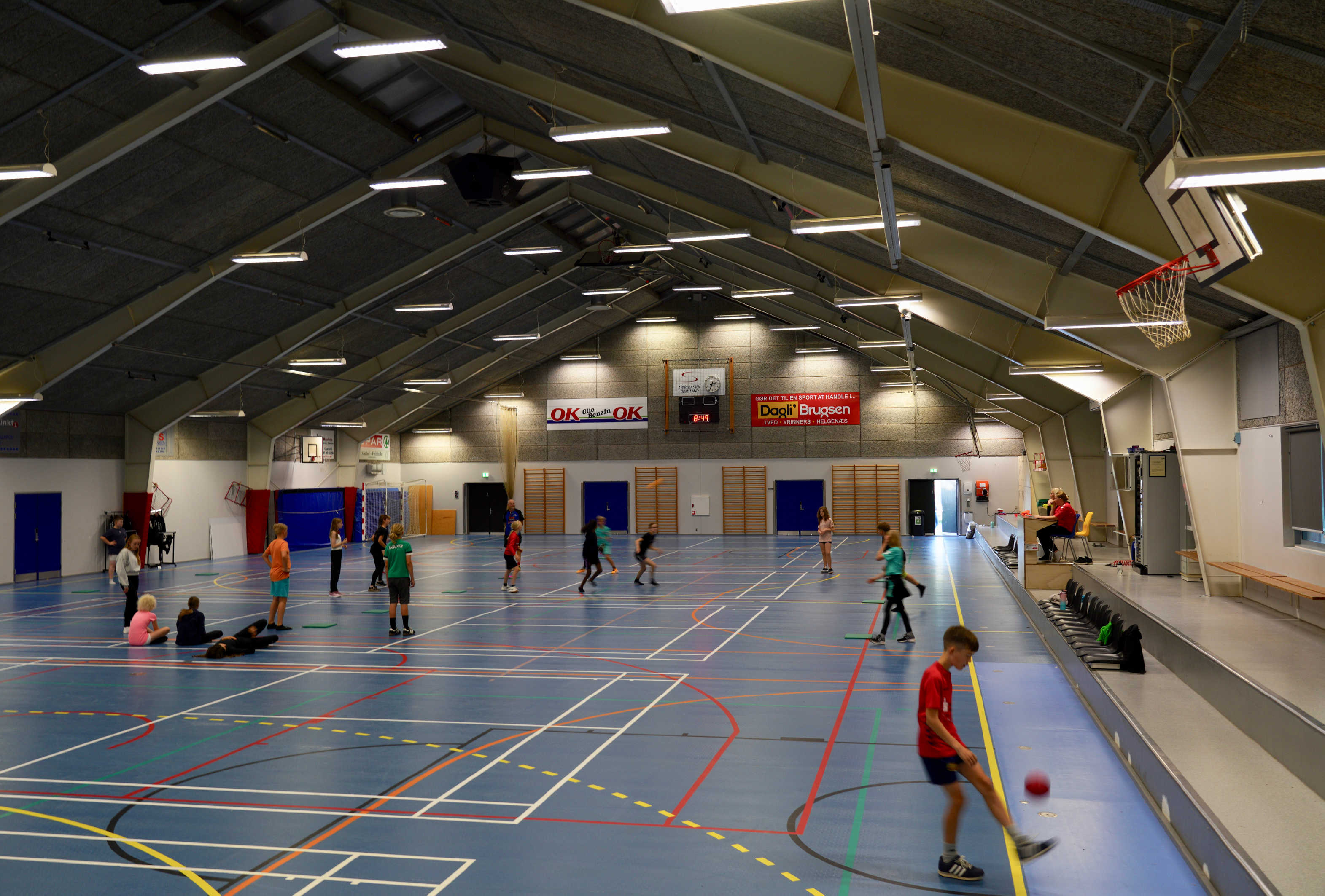 Den nye multisal og det nye madhus står som to sorte separate kuber mens en lavere bygning binder nyt og gammelt sammen og skaber et flow mellem de forskellige funktioner. I gangarealerne mellem funktionerne, er der indarbejdet opholdsarealer i form af sidde-nicher, reoler og opbevarings- og opholdsmøbler. Huset fremstår med betongulve og træoverflader samt store glaspartier ved ankomst og ud mod idrætsbanerne, hvilket skaber en lys og gennemsigtig bygning i et enkelt og aflæseligt udtryk. Huset fremstår gedigent og solidt både i materialevalg og farveholdning, samt i mødet mellem nye og gamle materialer som f. eks når en tidligere udendørs facade i blank gul mur nu danner bagvæg for et nyt tekøkken i et mødelokale.