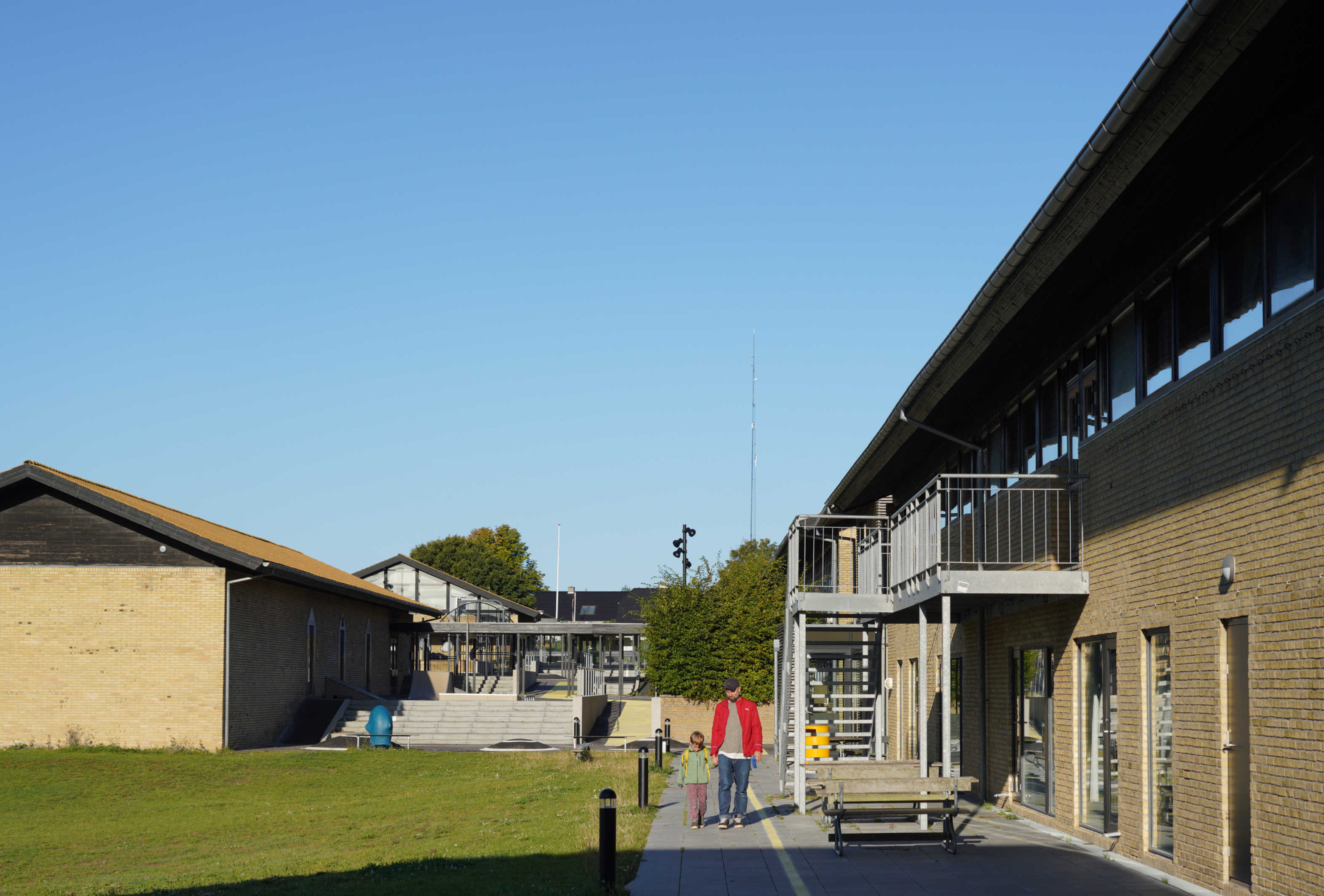 Mod syd ligger et udendørs opholdsområde med kig til byens boldbaner og øvrige idrætsfaciliteter. Herudover forbinder Molsværket sig mod vest til de nye skolegårde via et gult bevægelsesbånd der visuelt skaber sammenhæng mellem skole, lokalsamfund og idrætsfaciliteter. At samle byens funktioner på den måde og på det sted, der helt konkret samler livet på Mols, er en klog løsning der giver øget værdi til fællesskaberne i lokalsamfundet.