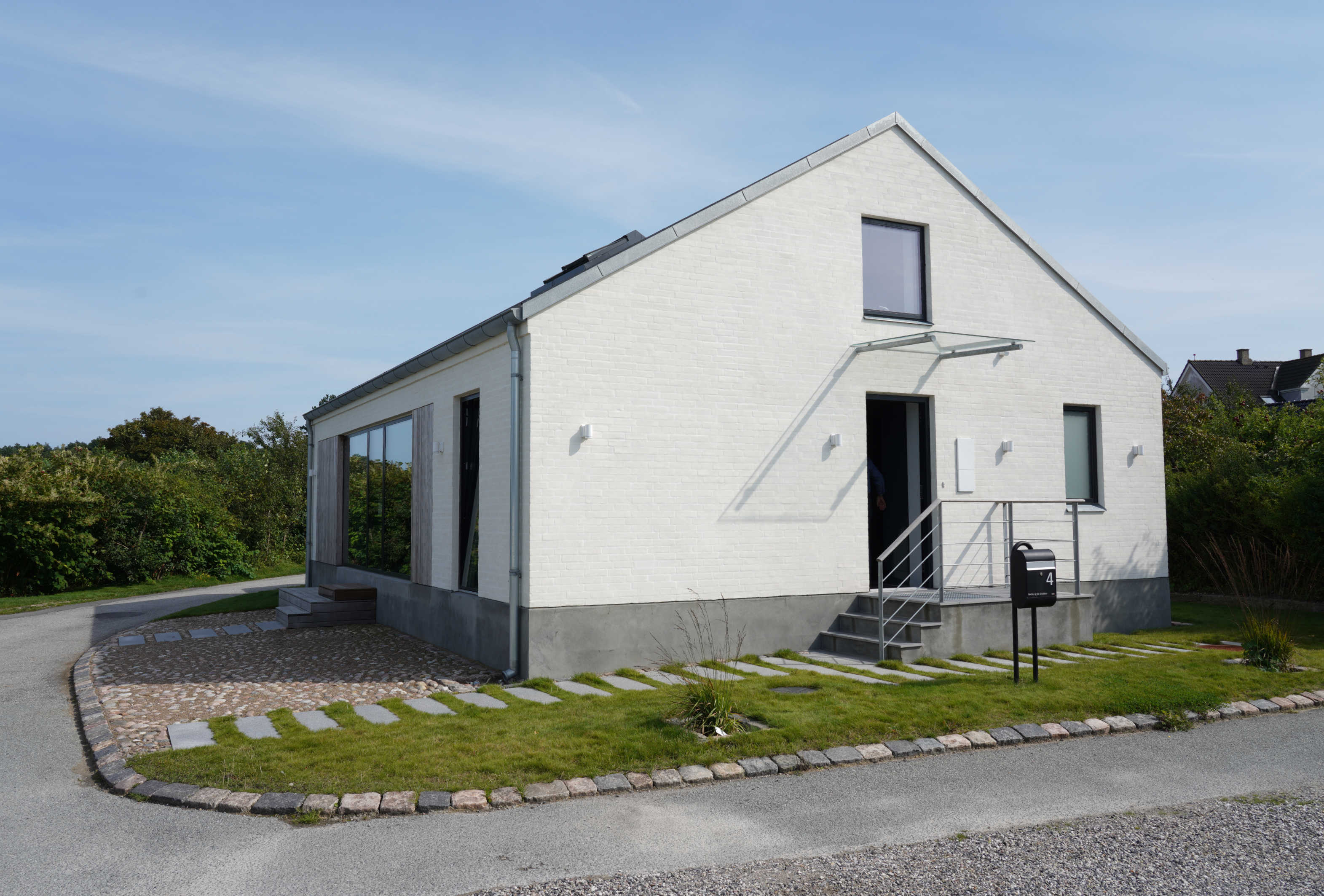 Fremtidens stigende vandstand er der taget højde for med en høj sokkel, og opvarmningen af det velisolerede hus foregår med solceller på taget og en luft til vand varmepumpe.