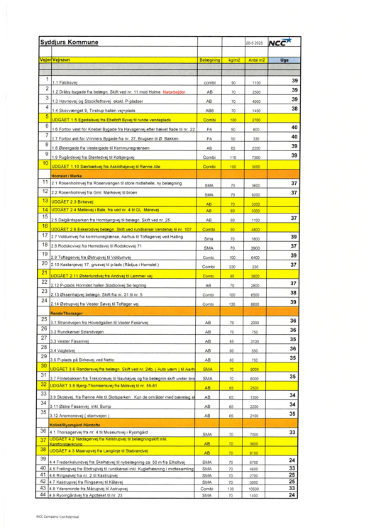 Asfaltbelægning I nedenstående oversigt kan du se det planlagte asfaltarbejde i Syddjurs Kommune for 2024 Spring sidemenuen over Indhold Det er Arkil A/S der udfører asfaltarbejdet for os i 2025. Arkil A/SBispemosevej 58361 HasselagerTelefon +45 86283055 Kort over asfaltarbejde Tidsplan over asfaltarbejder 2025 i Syddjurs Kommune Tidsplan syddjurskommune rev 2 Kontakt Mobilitet og Arealdrift Mandag-Tirsdag08:30 - 15:00 Torsdag08:30 - 17:00 Fredag08:30 - 12:00 Lundbergsvej 28400 Ebeltoft Telefon: 87535000 E-mail: veje.trafik@syddjurs.dk Skriv sikkert til os med MitID