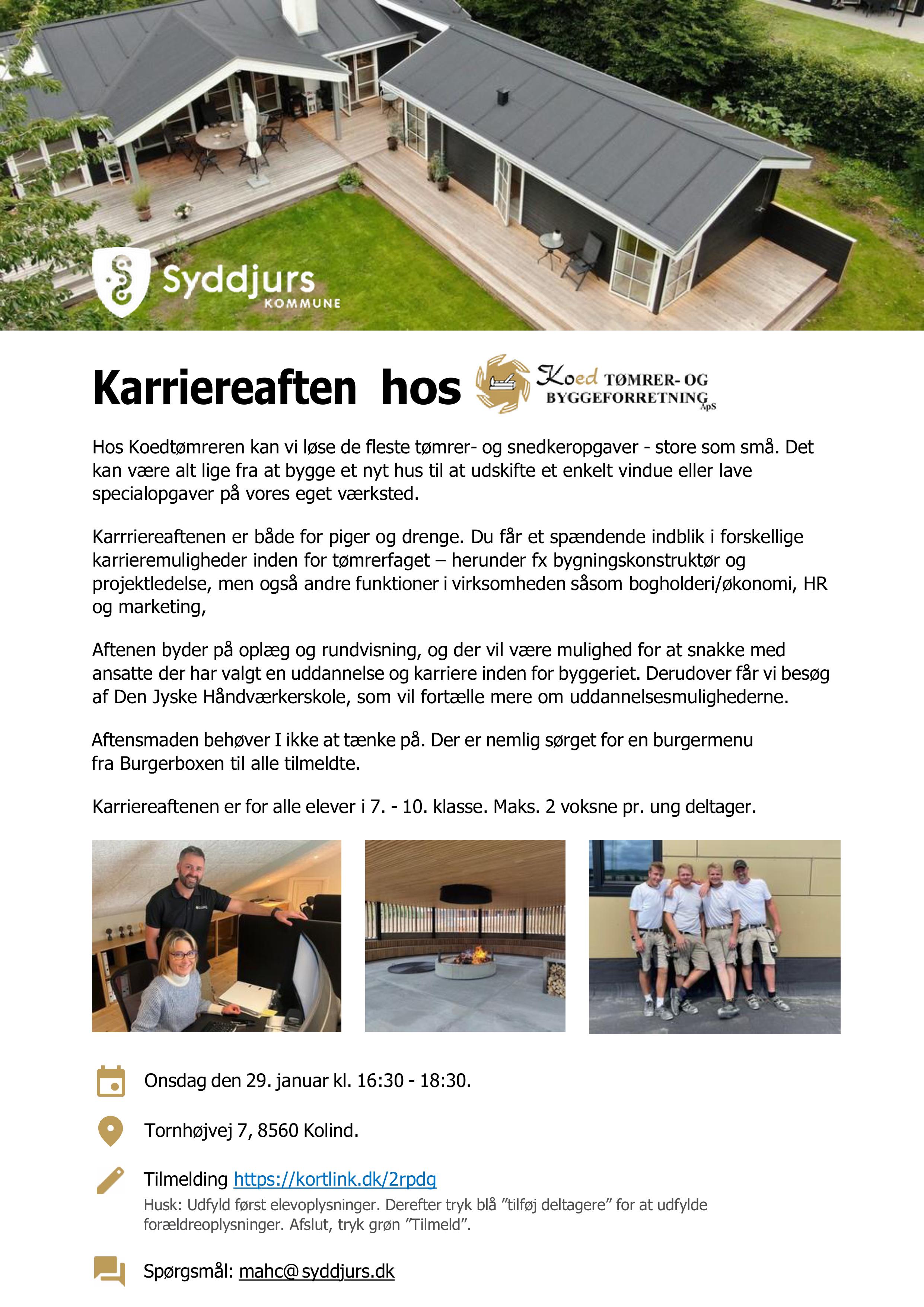 Karriereaftenen er både for piger og drenge. Du får et spændende indblik i forskellige karrieremuligheder inden for tømrerfaget – herunder fx bygningskonstruktør og projektledelse, men også andre funktioner i virksomheden såsom bogholderi/økonomi, HR og marketing.