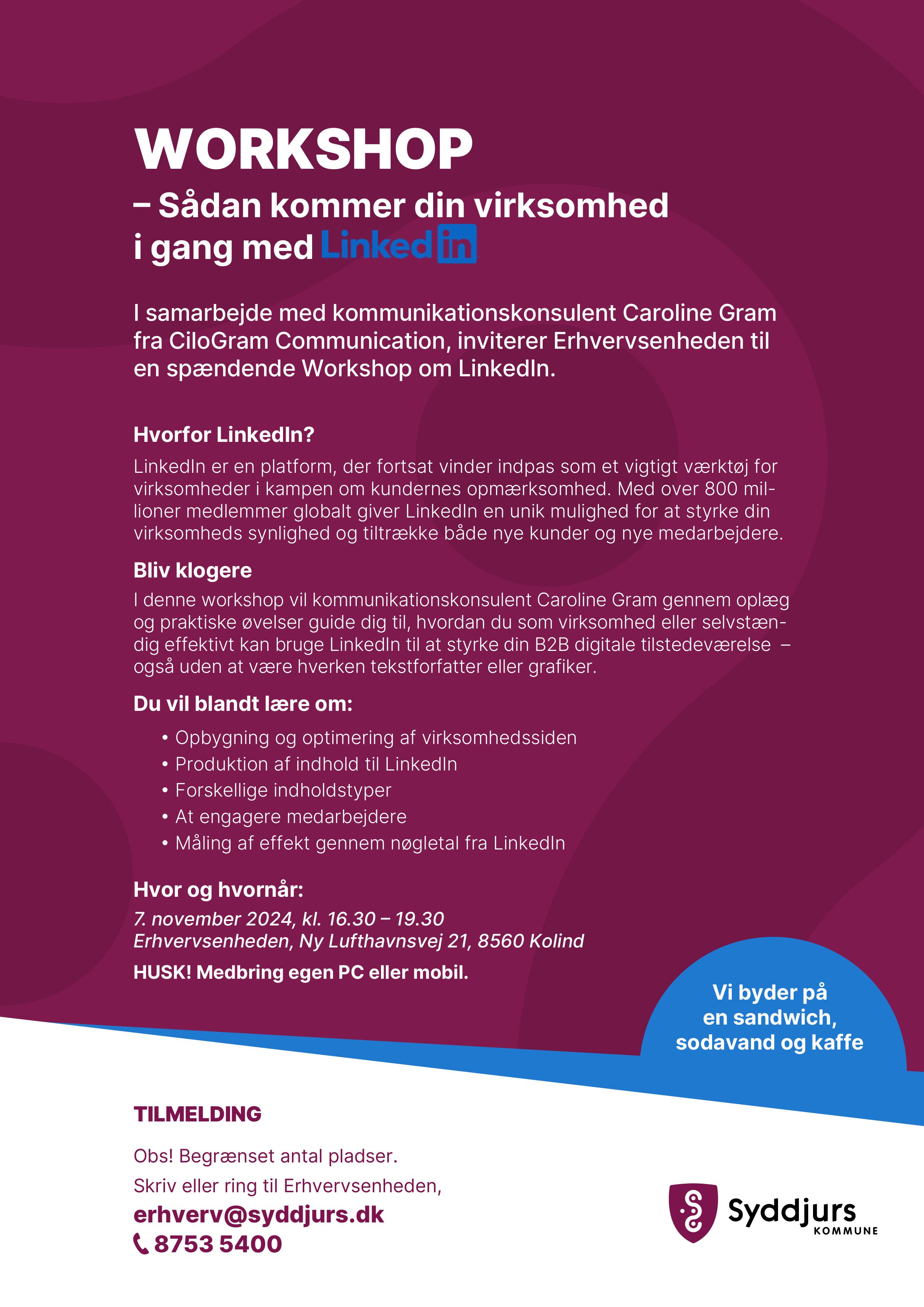 I samarbejde med kommunikationskonsulent Caroline Gram fra CiloGram Communication, inviterer Erhvervsenheden til en spændende Workshop om LinkedIn.
