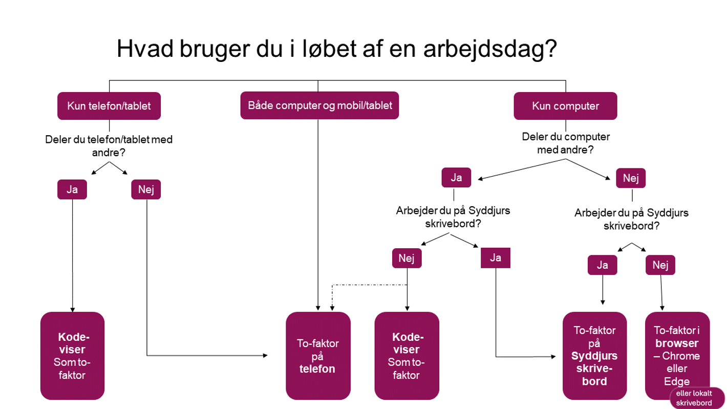 Som et ekstra sikkerhedstrin, skal vi til at bruge to-faktor, når vi logger ind i systemer, hvor flere myndigheder har adgang til de samme data. Din to-faktorenhed skal være personlig, det vil sige at den ikke kan være på en telefon, tablet eller computer, som I er flere, der deler. Ligesom man f.eks. kan med Microsoft Authenticator.