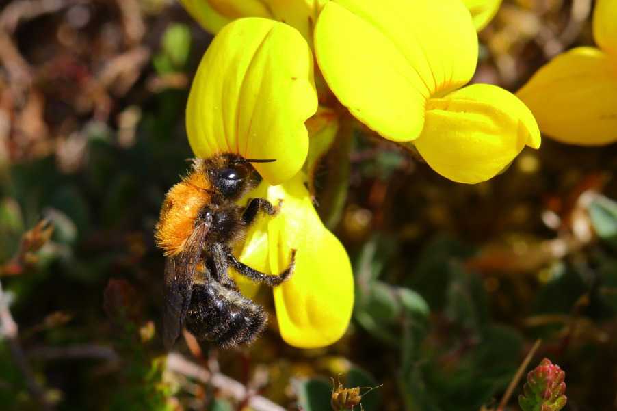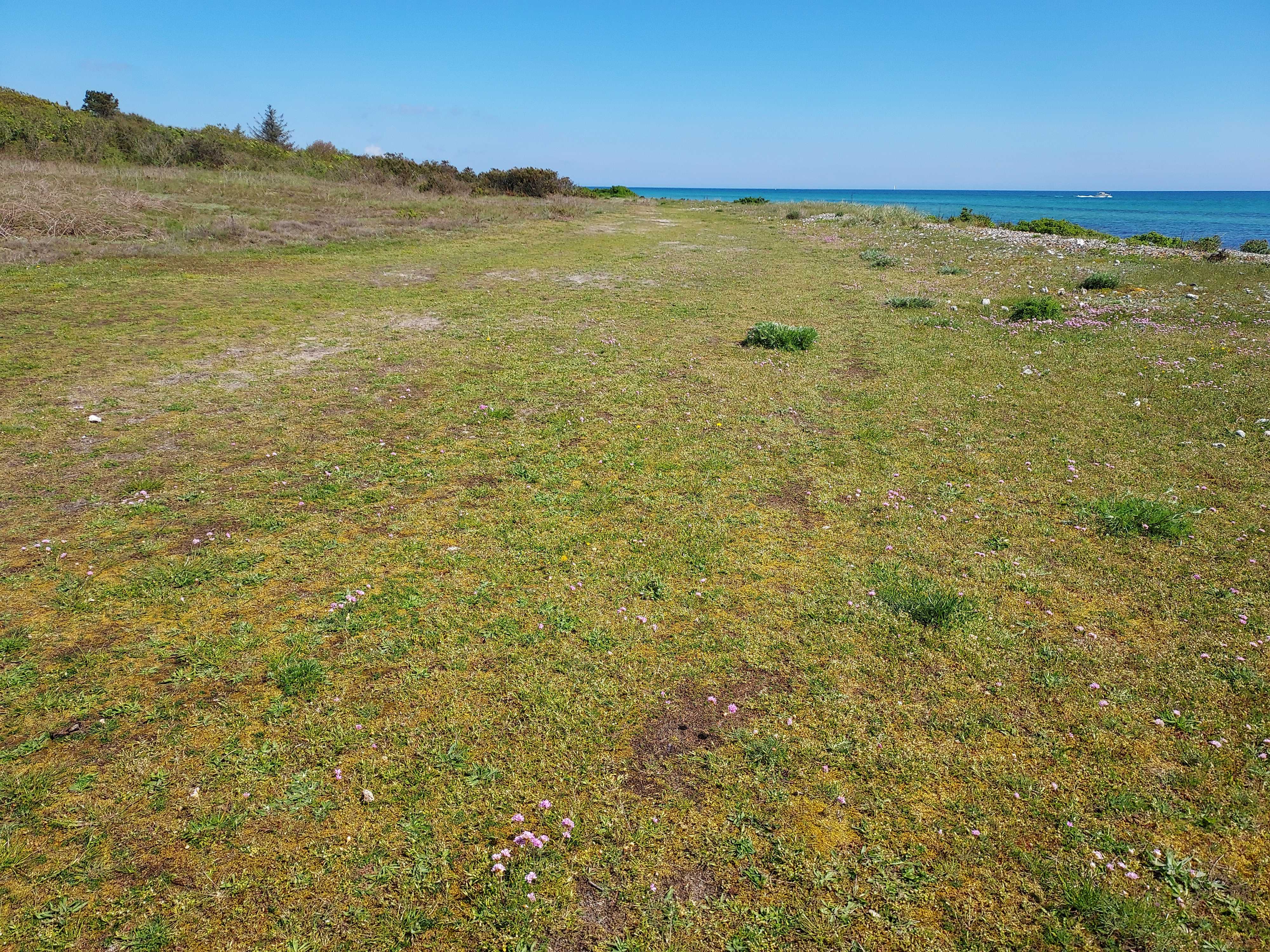Nedtrådt strandoverdrev- se, hvordan blomsterne er trådt væk. Det har formentlig udryddet den lokale bestand af den sjældne sommerfugl Gråbåndet bredpande. Hvis man i stedet trådte en smal sti, ville man ødelægge meget mindre.