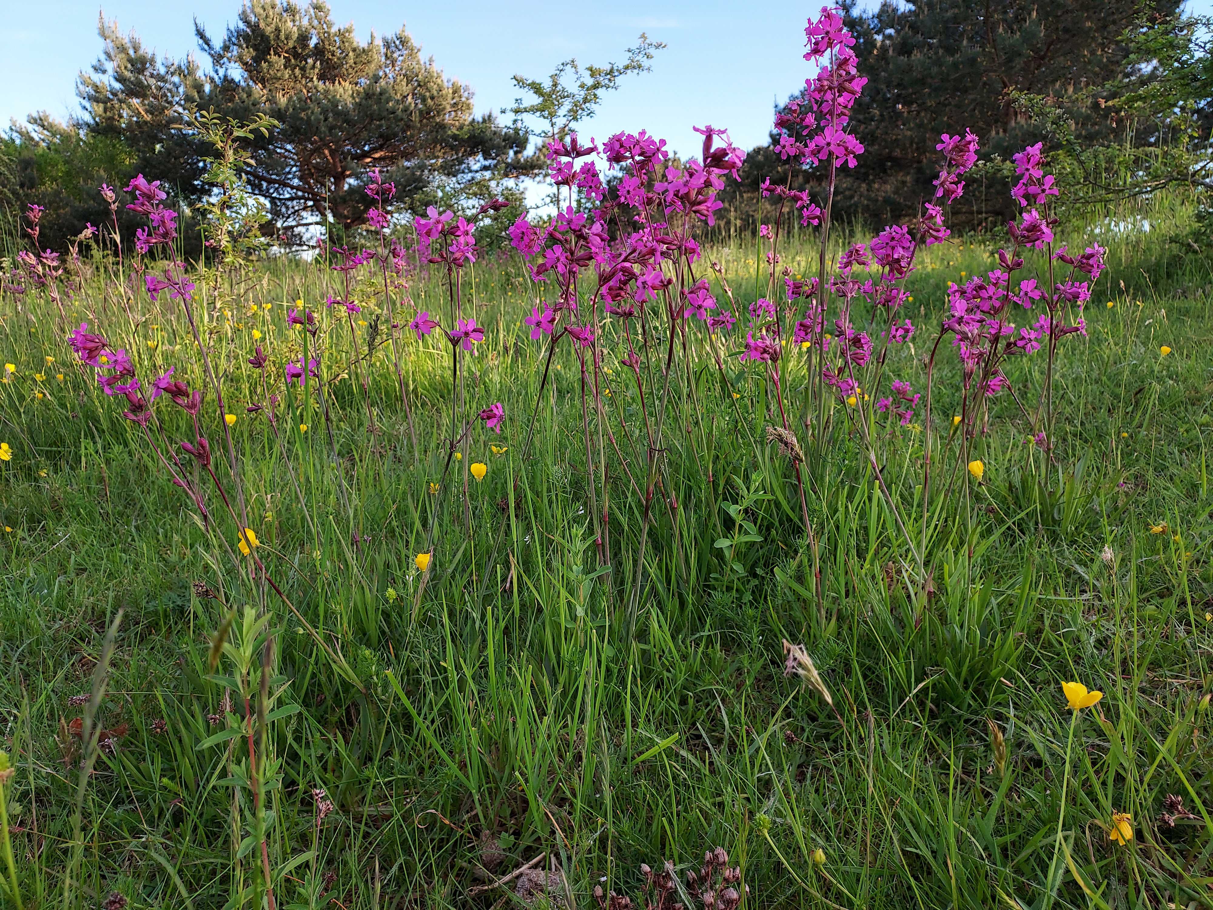 Mobil afgræsning- Ebeltoftprojektet. Vi har i et par år kørt et afgræsningsprojekt omkring Ebeltoft, hvor vi græsser ca. 25 folde af i korte perioder og flytter dyrene, når der er spist op. Det har givet MANGE flere blomster og har givet os blod på tanden, så det vil vi gerne lave mere af andre steder. Her har det givet Tjærenelliker på et overdrev på Fuglekongevej i Ebeltoft.