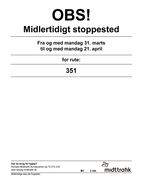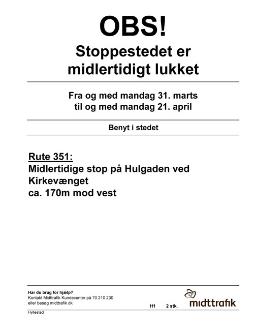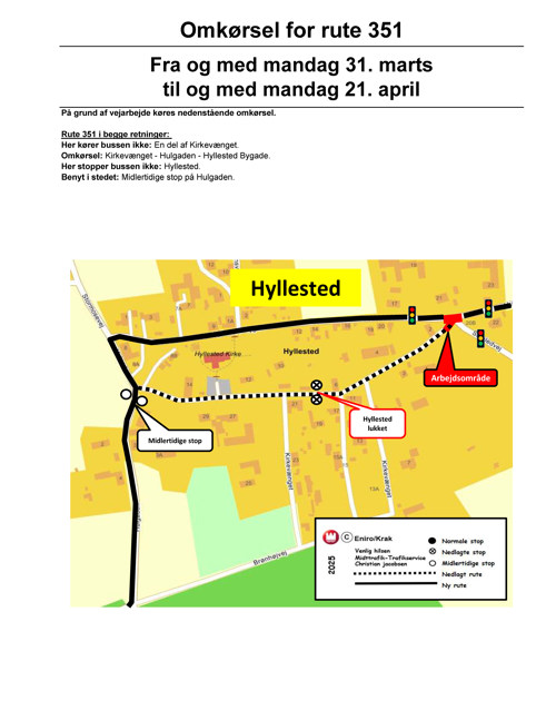 Nyheder Ny rundkørsel i Hyllested Der etableres omkørsel i perioden. Arbejdet forventes at være afsluttet den 21. april 2025. 26. mar. 2025 Spring sidemenuen over Indhold Vejarbejde i Hyllested fra den 31. marts: Ny Rundkørsel. Derfor laver vi omkørsel, og Midttrafik laver midlertidige bus-stoppersteder for rute 351 på Hulgaden. Arbejdet forventes at være afsluttet den 21. april 2025. Vi håber på forståelse og tålmodighed. Se kort og mere info herunder.