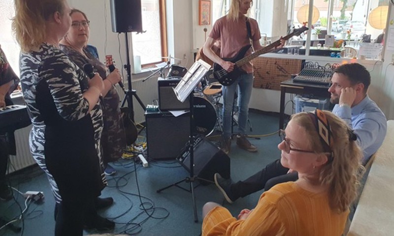 Så var det tid til besøg hos Folkestedet Grøn Kors. De arbejder for at fremme social bæredygtighed gennem aktiviteter for ensomme og udsatte borgere. Det kan være sommerlejre, tegne- og malehold, madlavning og musik. Grøn Kors har også Kolind Balladeband, hvor medlemmerne, som alle har forskellige udfordringer, bruger sang og fællesskab mod ensomhed, isolation og mentale udfordringer. På dagen gav bandet selvfølgelig et nummer.