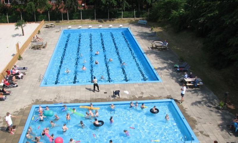 Svømmebadet kan byde på to opvarmede bassiner, hvor der plads til sjov og leg i vandet, men også til nogle hurtige baner i det store bassin. Trænger man til en pause fra vandet, kan der på det lækre "strandområde" spilles bordtennis, volley eller andre boldspil.