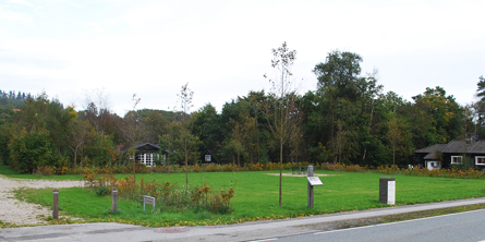 Fra denne lille lund er her udsigt over engen til Mols Bjerges skovklædte bakker i det fjerne