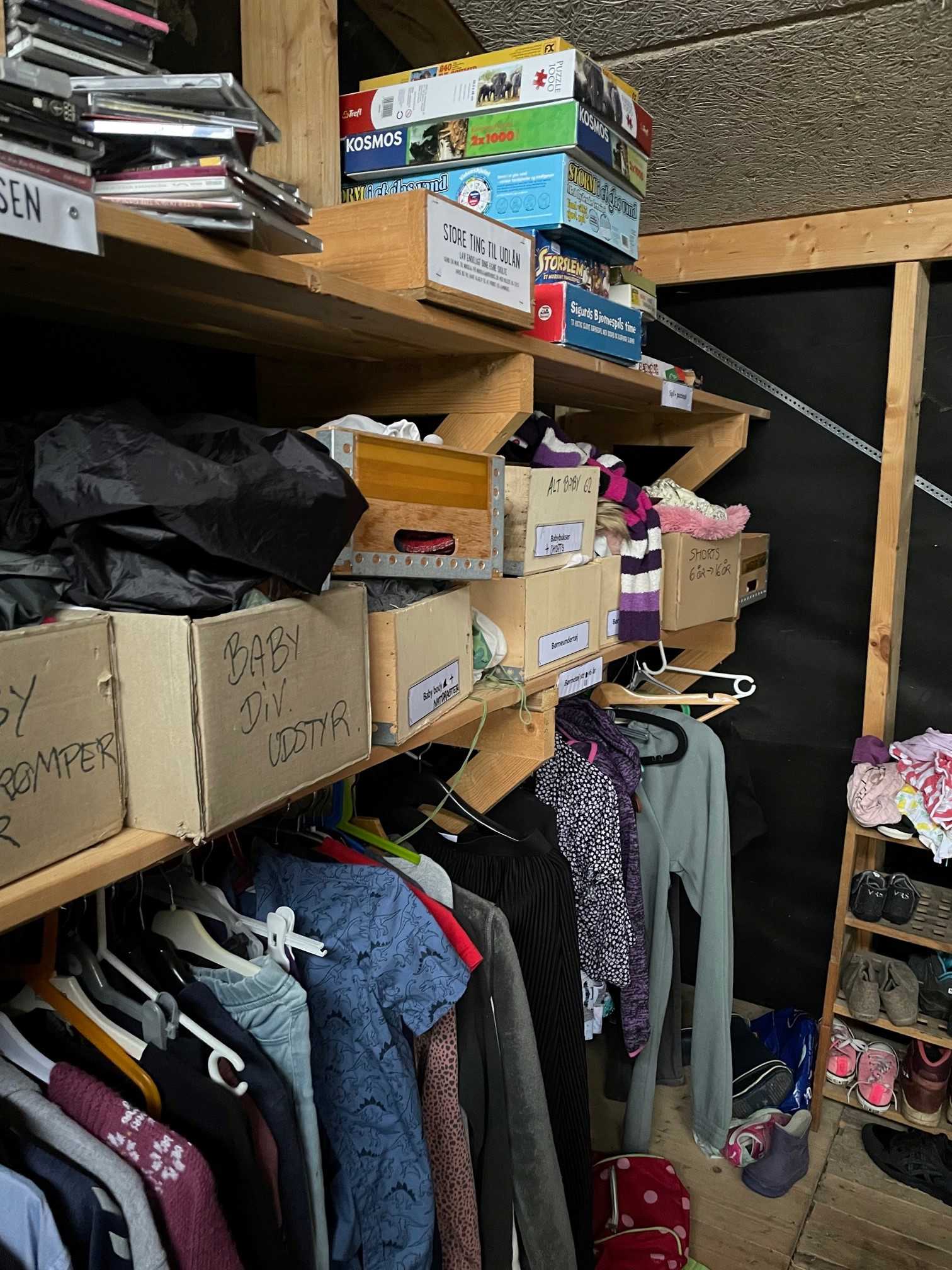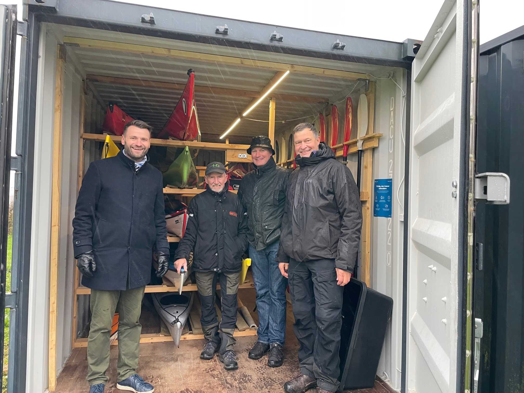 Tilbage ved forsamlingshuset nåede Borgmesteren et kig på de farvestrålende kajakker, som klubben opbevarer i store containere på en mark. Her lå de og ventede på tørvejr og bedre tider. Sæsonen er fra maj til oktober.