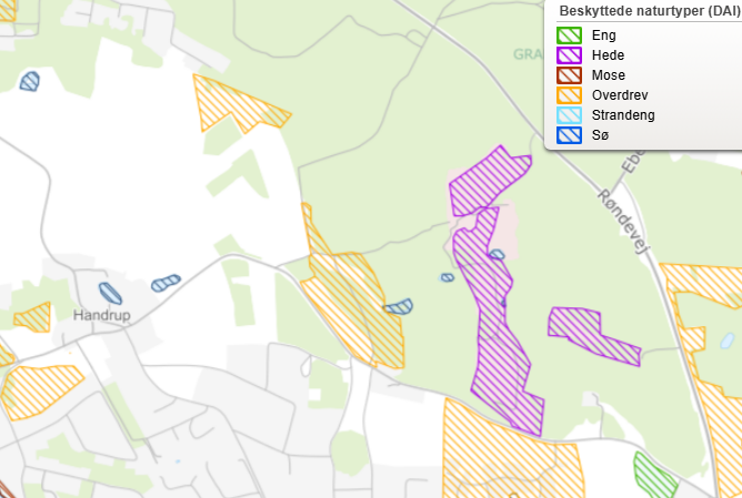 Du kan se hvilke naturtyper, der findes i dit nærområde på Danmarks Arealinformation (DAI). Følg dette link og søg på “beskyttede naturtyper”: